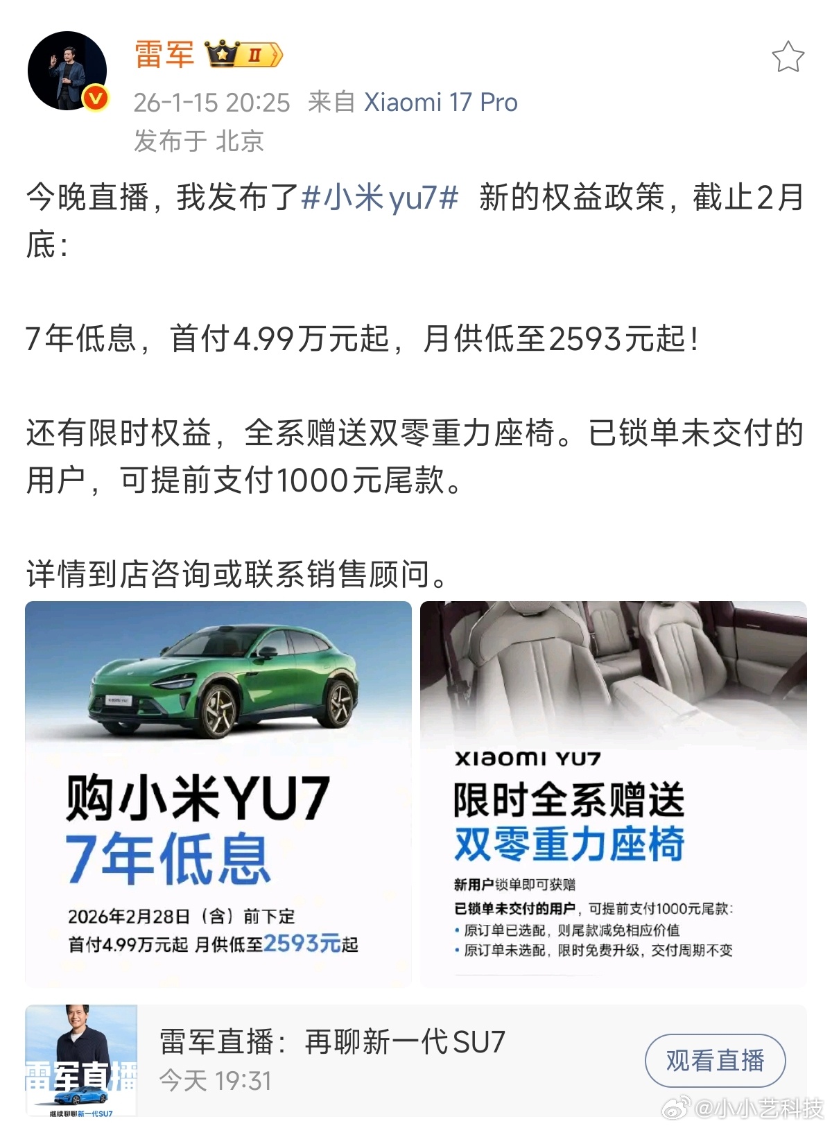 雷军疯了,这是不打算过日子了吗?小米YU7 7年低息,限时全系赠送双零重力座椅。