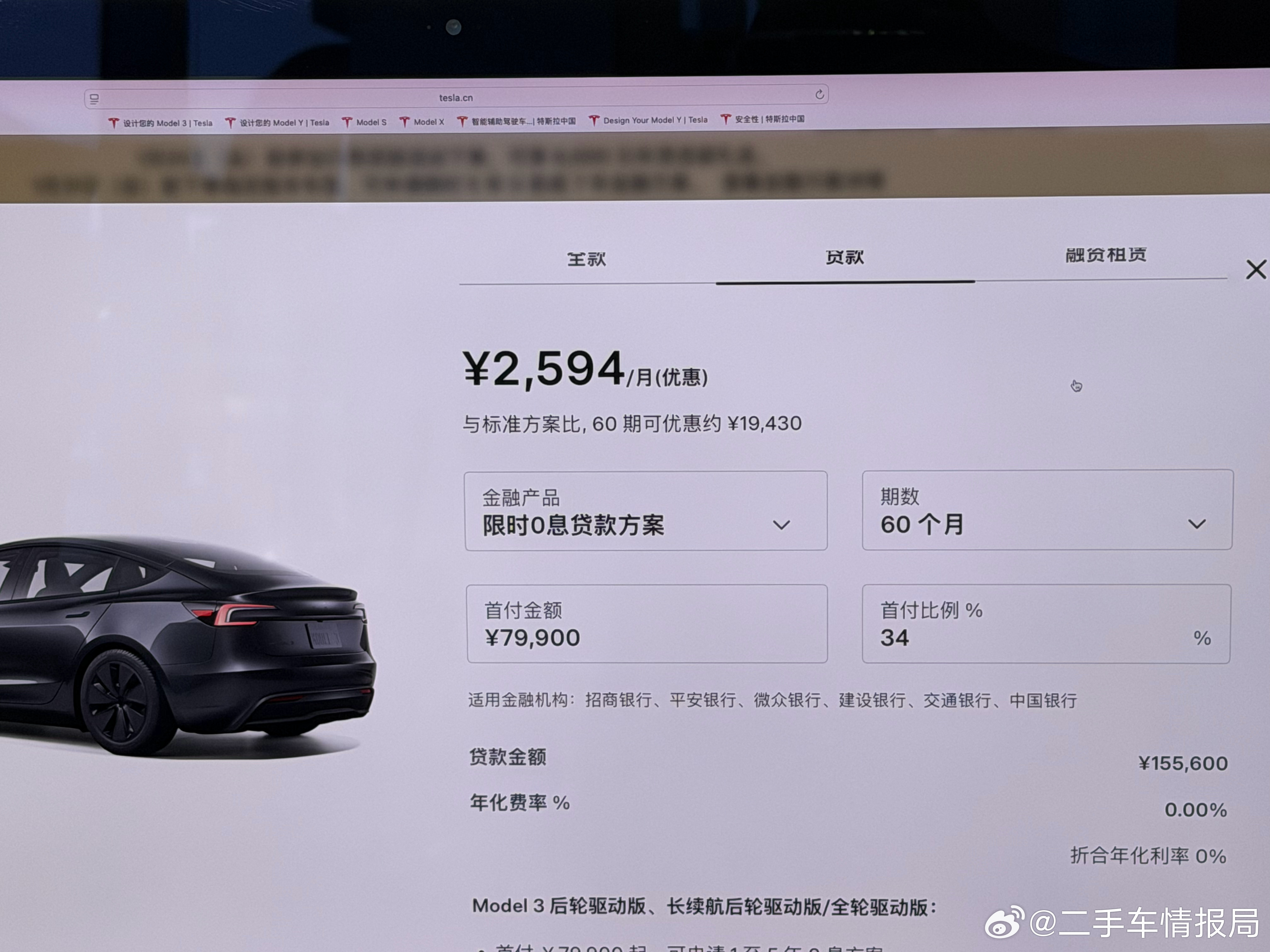 这个是model 3新车分期政策,5年免息,7年年均0.5%也很低,首付算上购置税和保险大概在9.8w,月供压力你们觉得怎么样…厂家贴息贴了不少钱的,这确实是新车的优势二手车的话做不到,最低也要3%的年息,但是他首付可以做到接近0首付,各有优势,自己斟酌就好