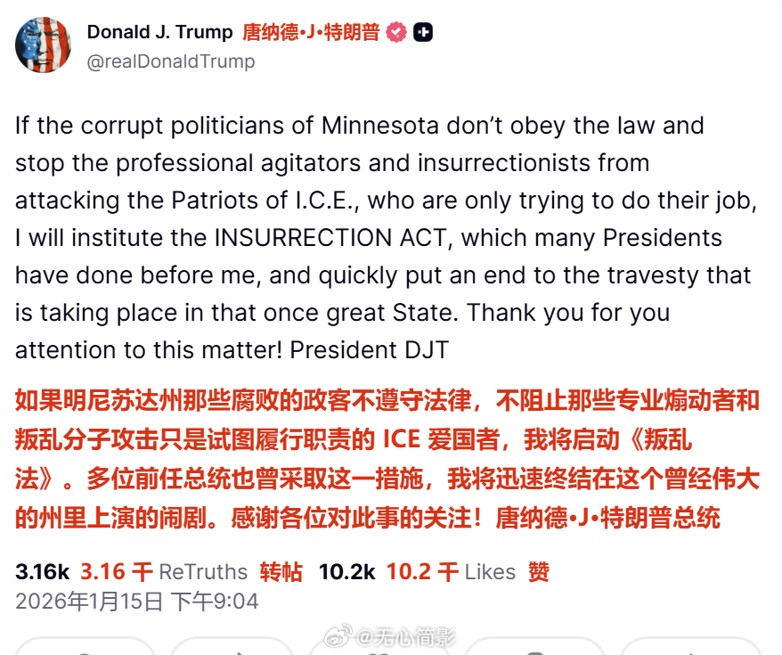美国明尼阿波利斯今天再次发生枪击事件后,特朗普威胁将启动《叛乱法》。该法律授权美国总统在特定情况下,可以无需州长同意,直接部署联邦军队(包括现役部队)和联邦化的国民警卫队,该法通常在州政府“无法维持秩序”或存在“叛乱、国内暴力妨碍法律执行”时触发。特朗普此前曾威胁要动用《叛乱法案》并派遣美军,以应对去年秋天波特兰的反ICE抗议活动。上一次总统动用该法律是在 1992 年,当时加州州长向乔治·H·W·布什总统请求帮助处理洛杉矶的骚乱。今天发生的枪击事件详情看这里:网页链接 海外新鲜事ICE枪击事件引发大规模抗议