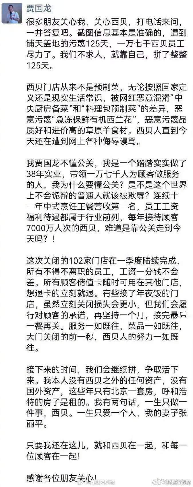 贾国龙再次强调西贝不是预制菜虽然我不吃西贝,你说贵了,便宜了,由市场规律去调节