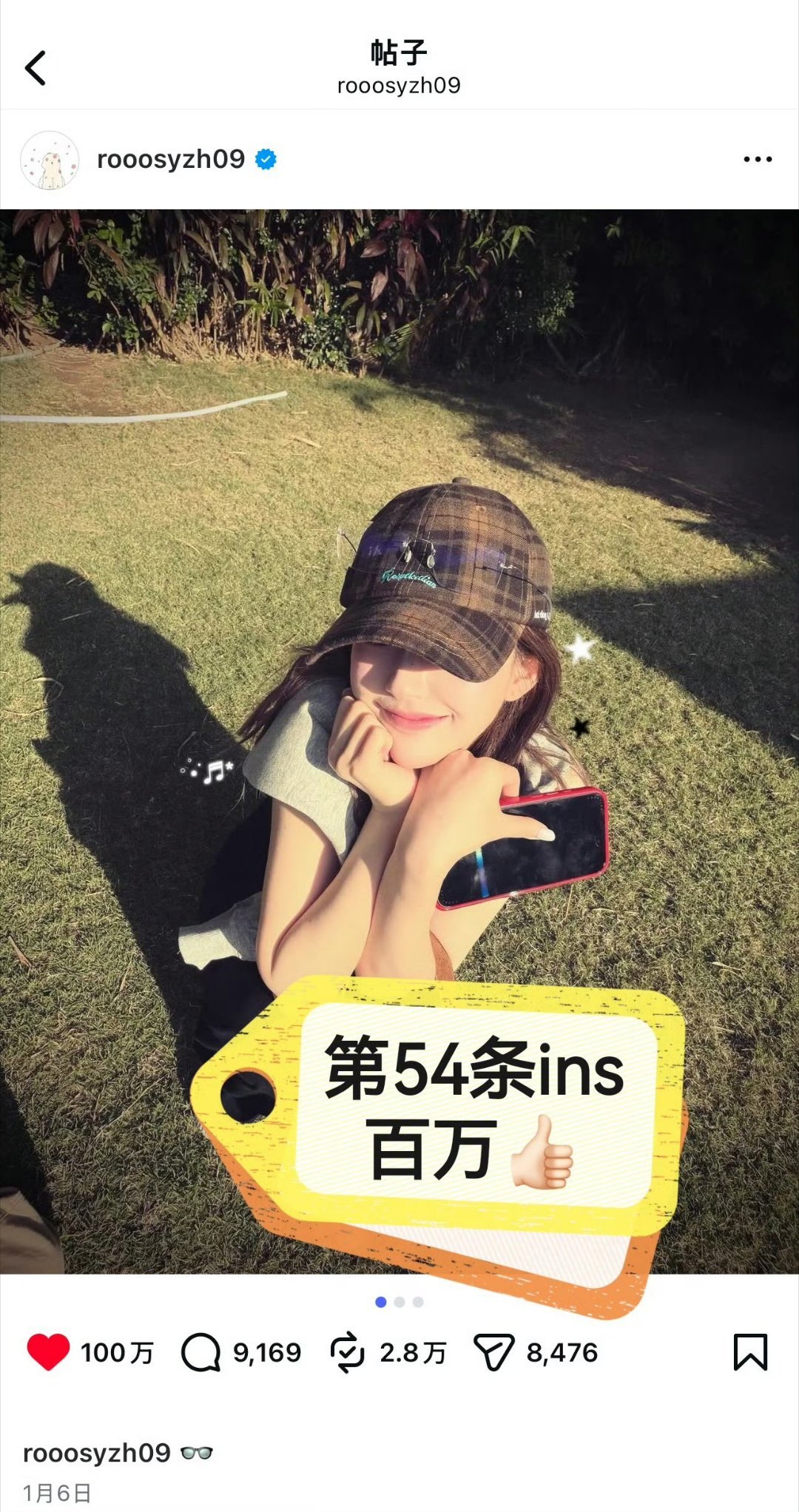赵露思1月6日更新的ins突破百万赞,累计54条百万赞ins,果然是海外女顶
