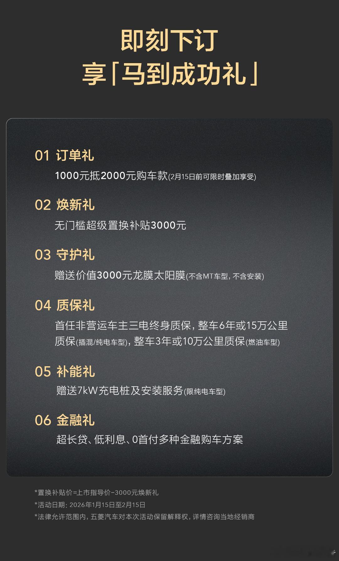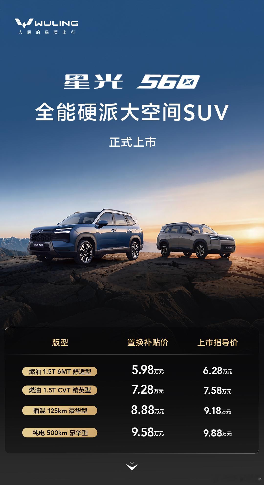 星光560正式上市:5.98万元起1月15日,五菱“全能硬派大空间SUV”星光560上市,共推出4款车型,涵盖燃油、插电和纯电三种动力,售价区间6.28-9.88万元,置换补贴价为5.98-9.58万。车身尺寸方面,长宽高分别为4745/1850/1755(1770)mm,轴距为2810mm,定位A+级SUV,全系标配18英寸轮圈。内饰方面,提供暖沙棕和胡桃棕两种配色。中央镶嵌12.8英寸娱乐屏,内置Ling OS系统并支持HiCar、CarLink、DLNA等手机互联,采用怀挡设计,因此中央扶手区域有着丰富的储物空间。新车提供大五座和七座两种座椅布局。新车后备厢常规容积763L,还有184L隐藏式下沉空间,后排座椅放倒后,最大可扩展至1945L,而且后排座椅下方额外设有32L隐藏式储物格。动力系统方面,燃油版车型搭载1.5T发动机,最大功率为130千瓦,峰值扭矩为290牛·米,与之匹配的是6挡手动变速箱和CVT变速箱。插电混动版搭载灵犀动力3.0技术,其由1.5L发动机与电机组成,最大功率分别为78千瓦和145千瓦,其CLTC纯电续航125公里,WLTC综合续航里程高达1100公里,WLTC亏电油耗仅为5.3L/100km。电动版车型搭载最大功率为100千瓦集成式驱动电机系统,并搭载60kWh神炼电池,CLTC工况下的纯电续航500km,官方电耗13.6kWh/100km,支持2C充电,30%-80%仅20分钟,15分钟补能200km。汽场全开五菱星光560星光560空间堪比大平层星光560上市惊喜价59800起