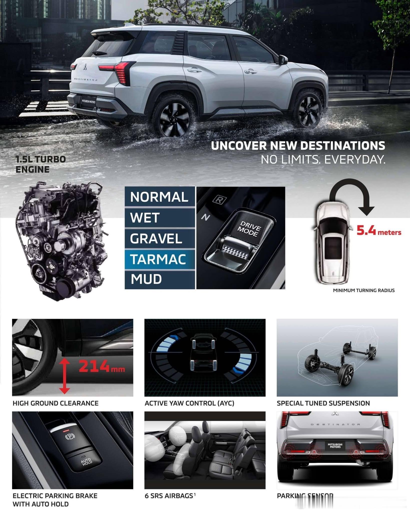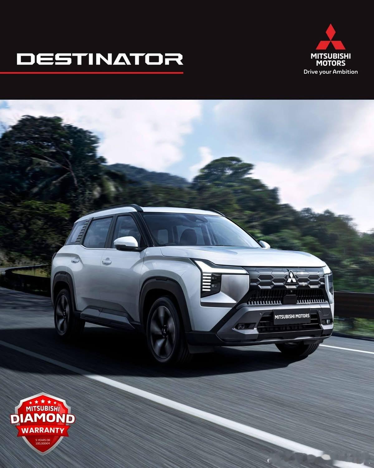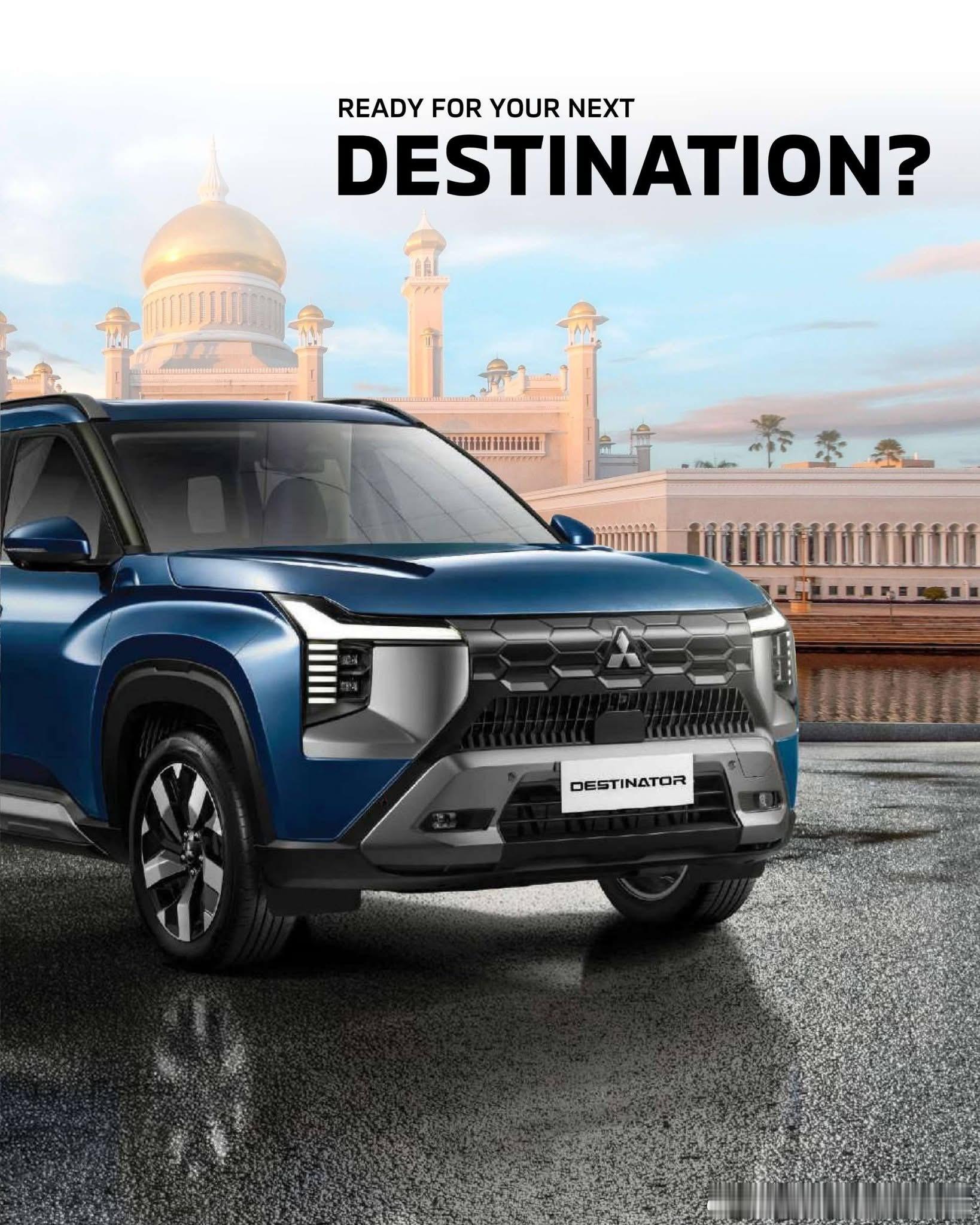 2026三菱Destinator是三菱汽车推出的一款全新中型SUV,主要面向东南亚、南美洲、中东和非洲市场销售。• 车型基础:基于三菱DST概念车开发,与三菱紧凑型SUV Xforce共享前驱平台,可视为Xforce的三排七座版本。• 外观设计:继承了Xforce的设计风格,保留T字形LED前灯组,前格栅采用半封闭式设计,并增加银色饰板。车身尺寸为4680/1840/1780毫米,轴距为2815毫米。• 内饰配置:内饰在Xforce基础上调整了空调出风口设计,换挡杆为机械式。配备12.3英寸中控屏、8英寸液晶仪表盘、64色车内氛围灯和雅马哈Premium音响系统等。• 动力系统:搭载型号为4B40的1.5T MIVEC汽油发动机,最大功率120千瓦,峰值扭矩250牛·米,传动系统匹配CVT无级变速箱,全系为前轮驱动。三菱Destinator于2025年7月在东南亚市场全球首发。2025年11月,三菱汽车菲律宾公司开启了Destinator的预订工作。2026年1月,该车在台北新车大展上亮相。