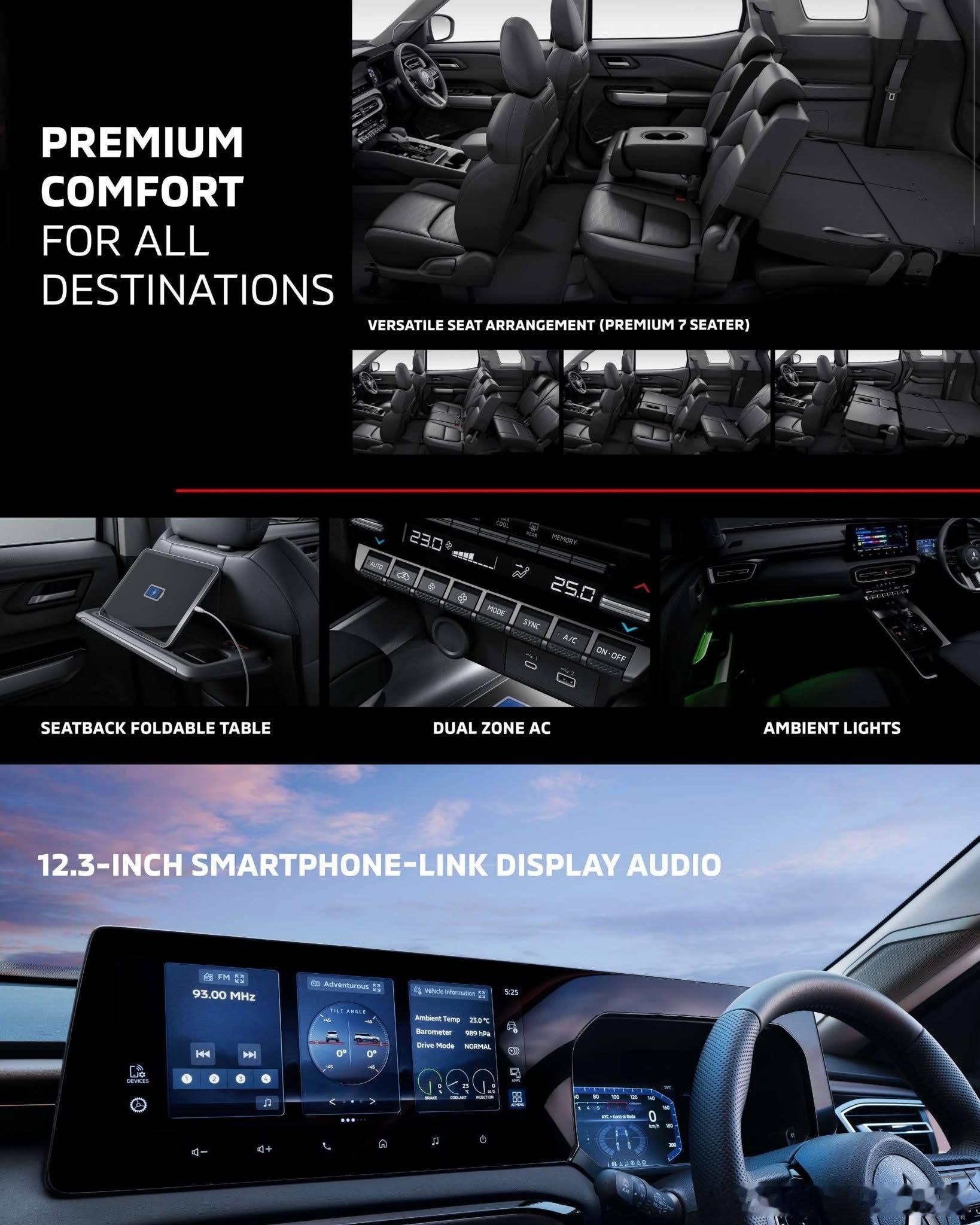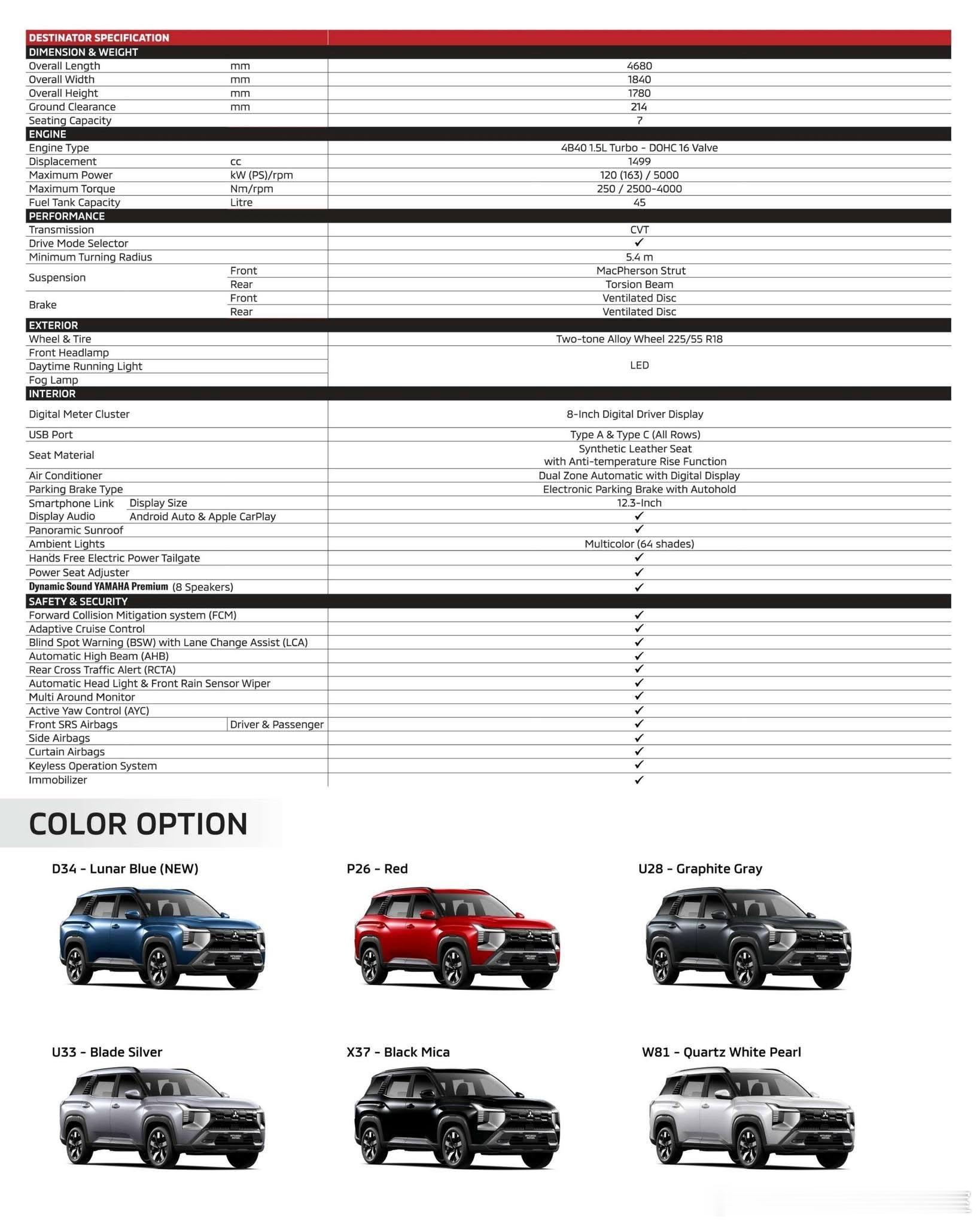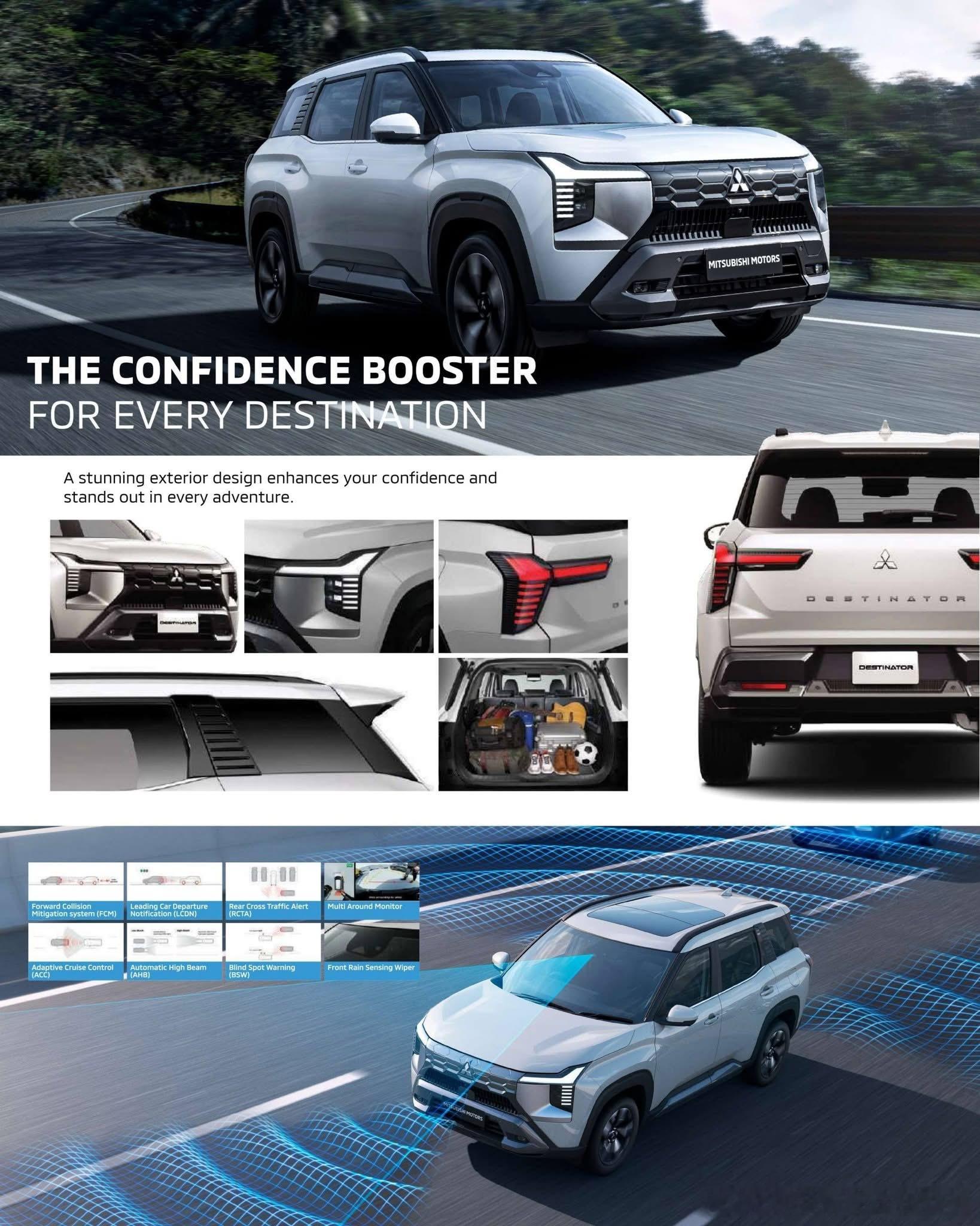 2026三菱Destinator是三菱汽车推出的一款全新中型SUV,主要面向东南亚、南美洲、中东和非洲市场销售。• 车型基础:基于三菱DST概念车开发,与三菱紧凑型SUV Xforce共享前驱平台,可视为Xforce的三排七座版本。• 外观设计:继承了Xforce的设计风格,保留T字形LED前灯组,前格栅采用半封闭式设计,并增加银色饰板。车身尺寸为4680/1840/1780毫米,轴距为2815毫米。• 内饰配置:内饰在Xforce基础上调整了空调出风口设计,换挡杆为机械式。配备12.3英寸中控屏、8英寸液晶仪表盘、64色车内氛围灯和雅马哈Premium音响系统等。• 动力系统:搭载型号为4B40的1.5T MIVEC汽油发动机,最大功率120千瓦,峰值扭矩250牛·米,传动系统匹配CVT无级变速箱,全系为前轮驱动。三菱Destinator于2025年7月在东南亚市场全球首发。2025年11月,三菱汽车菲律宾公司开启了Destinator的预订工作。2026年1月,该车在台北新车大展上亮相。