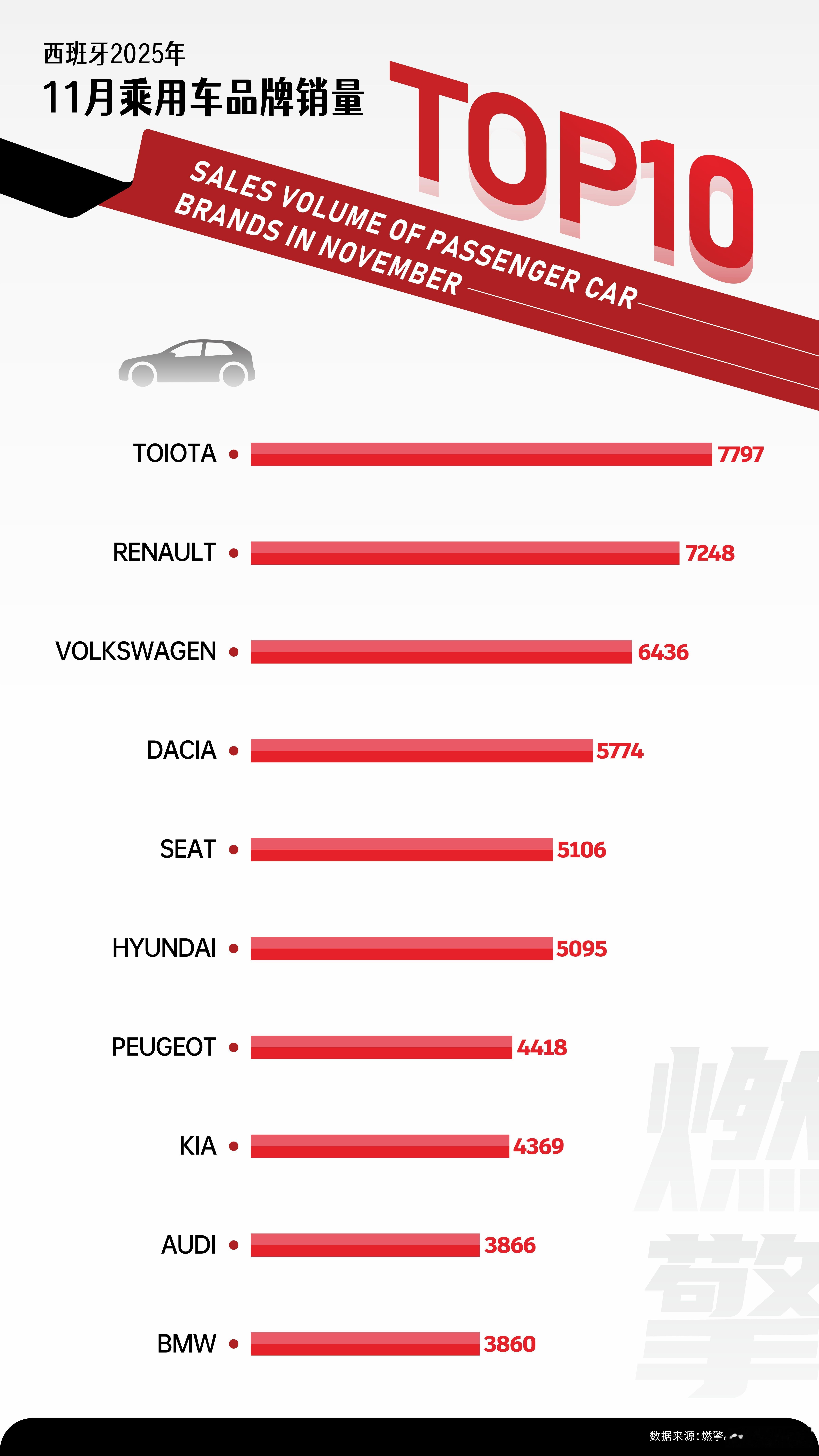 2025年11月,西班牙新车销量前十的品牌榜单显示,市场仍由日系与欧系品牌主导,且头部品牌间的竞争态势较为均衡。丰田、雷诺和大众位列前三,销量分别为7797辆、7248辆和6436辆,彼此差距不大。丰田凭借其可靠耐用的SUV和家用车型,适应了当地多样的地形和出行习惯。雷诺、大众以及达契亚等欧洲本土品牌,则依靠经济型轿车和小型SUV精准匹配城市通勤需求,加之本土渠道优势,占据了稳固的市场份额。处于第二梯队的现代、标致、起亚等品牌,销量在4000至5000辆区间,以高性价比车型覆盖中端市场;奥迪、宝马等豪华品牌则聚焦于高端消费群体。整体来看,市场形成了不同价位带的清晰分层。值得注意的是,前十名中尚无中国品牌的身影。这表明中国品牌在西班牙乘用车市场仍处于初步渗透阶段,尚未进入主流竞争序列。未来或许可以凭借新能源车型或突出的性价比优势,在市场中寻找突破口。大v聊车