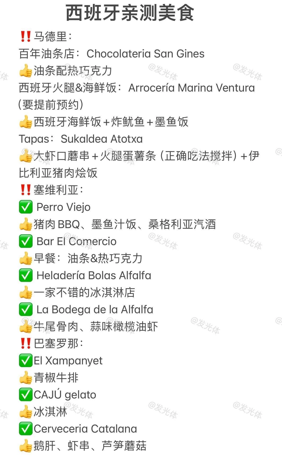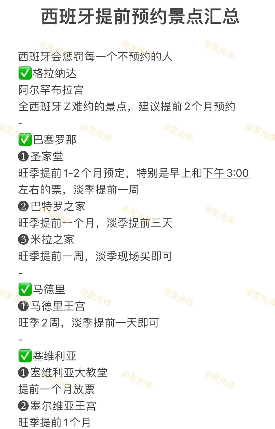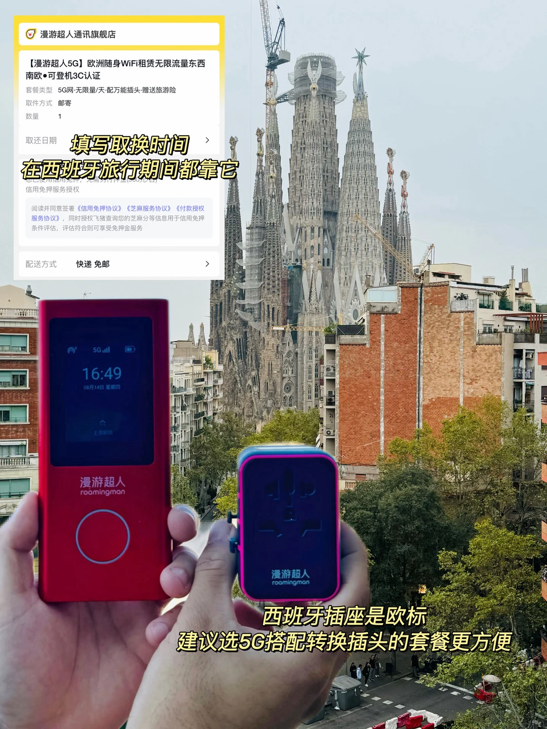 西班牙是欧洲值得推荐的旅行目的地,我是,正在挑战环球100国,已完成84国 - 📅行前准备 ❶申根旅行保险(见图5) ❷景区门票 需提前预订景点(见图6) ❸驾照及翻译件 ❹租随身WiFi及转换插头(图7-10) 和朋友一起出行,上网真的踩过太多坑!一定要信号稳定可以上外网,且可以跨国多人一起使用(西班牙行程建议把直布罗陀和安道尔一起玩了) - ✅行程安排 见图1 - ✈️交通方式 见图1标识 - 🌈各城市如何玩 ❶马德里:citywalk一天(路线图2) ❷塞维利亚:安排了两个整体天(路线图3) ❸直布罗陀:观岩石、机场、灯塔、观景台 ❹格拉纳达:阿尔罕布拉宫 ❺巴塞罗那:安排了2-3天(线路图4) ❻安道尔:多半天 - 📶通讯方式: 租漫游超人随身WiFi&转换插座(图7-10) 我手机已经插了双卡,而且还会进行多国游,不适合用流量卡。流量包担心不能上外网,没办法用谷歌导航。所以这次和朋友3人去西班牙玩,在🍑租的漫游超人,确实它更适合多人多国自由行 ❶欧洲有很多家运营商,网络很不稳定,如果你不想研究哪家好坏,可以像我一样用漫游超人。如果当下网速慢了,点一下优化,它就能自动匹配当地网络更好的运营商,不管是在西班牙、安道尔哪里 ❷我选的不限流量套餐,旅途上传几十G的素材都不心疼,还是5G网速,之前买流量卡1天1G,根本不够用 ❸外网也是出国旅行刚需!在西班牙全程靠谷歌地图精准导航找景点、找小众餐厅 ❹续航也很顶,早出晚归逛一天,全程连网都不用中途充电,能满足一天的用网需求 - 🔌多功能转换插头 租它家Wi-Fi的时候,建议把转换插头一起选上,在西班牙还是需要转换插头的! 💗春节期间预订还送U型枕,长途飞行刚需,让旅程更舒服! - 💰如何预定 如图7,出发前可以快递到家也可以在机场领取 - ✳️常用App 🗺️导航:Google Mpas 🏠住宿:Airbnb 🚉火车汽车票:Omio - 🌈西班牙美食 亲测:图11 - ⚠️Tips ❶停车一定不能乱停,罚款贵 ❷小偷比较多,护照和钱包,卡和现金要分开