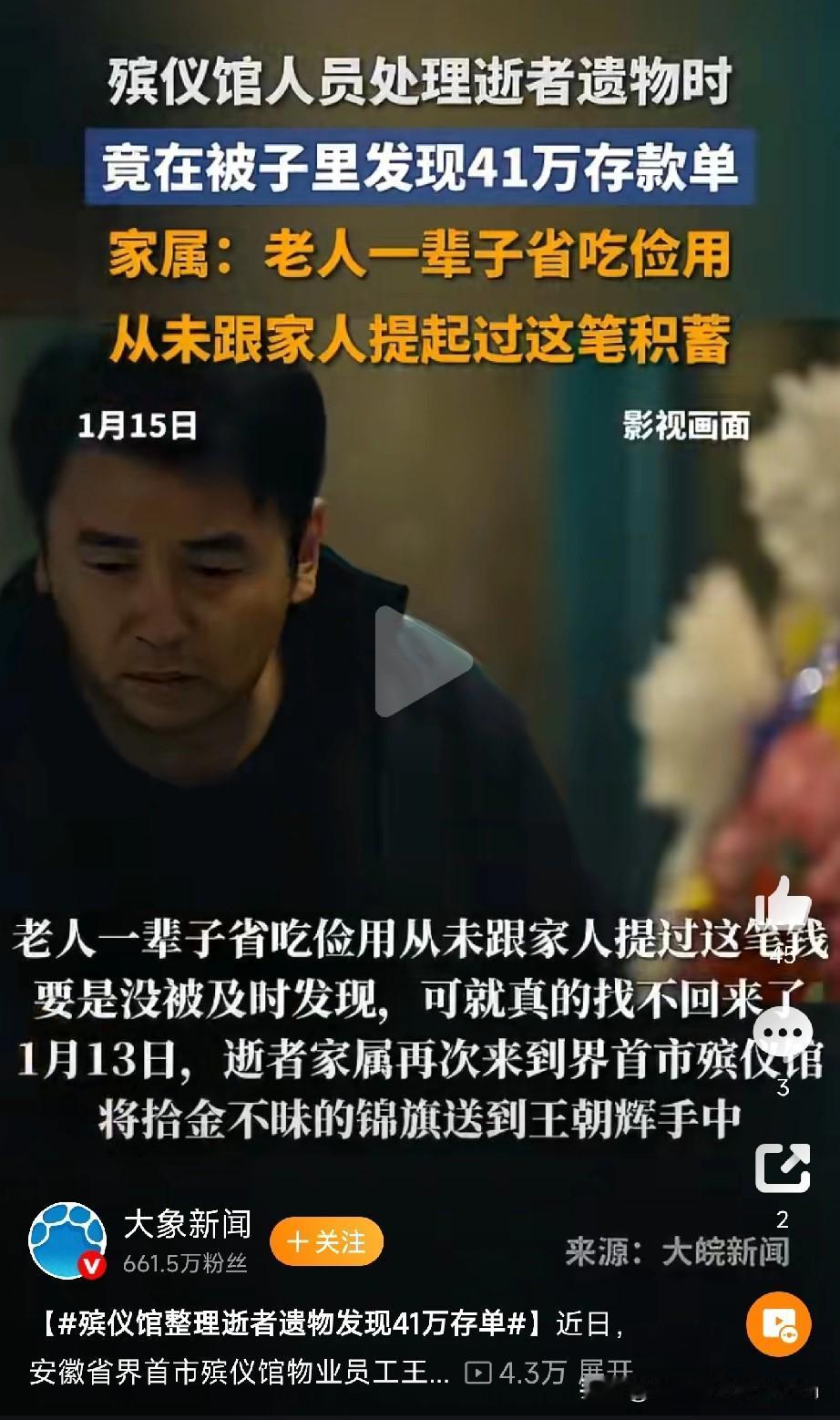 41万存单差点火化! 整理遗物真的要看仔细。 安徽界首殡仪馆小哥,在处理遗物时突然发现一床被子不对劲——角落鼓鼓囊囊的! 拆开一看,当场惊呆:三张存单!工行21万、中行14万、农行6万,加起来整整41万! 原来,老人省吃俭用攒了一辈子的钱,偷偷藏被子里,去世后家人毫不知情,差点连钱带被子一起烧了! 要是晚一步,这41万可就灰飞烟灭了啊! 这小哥立马变身“寻亲侦探”,联系公司、查档案、找家属…一天就锁定了家人! 电话那头,家属直接懵圈:“根本不知道有这笔钱啊!”见面时拉着小哥的手哭成泪人:“这不仅是钱,是老人留给我们最后的念想啊!” 现在家属送上锦旗,小哥却摆手:“应该的!咱干这行,细心点就能帮大忙!” 网友们的评论炸锅了: “这小哥简直是救命恩人!细心救了一家子!” 以后整理遗物真得仔细啊! (文章素材来自大象新闻,侵删)