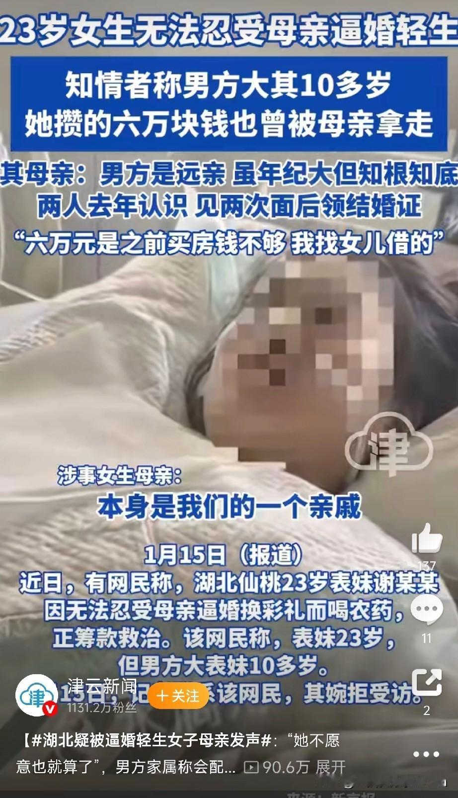 这个年代还有逼婚的 湖北仙桃一个23岁的姑娘,因为受不了家里逼婚,竟然喝农药轻生。更让人难受的是这些细节: 她从小是外婆带大的,辛辛苦苦干保安,一个月两三千块钱,省吃俭用攒下6万血汗钱,被母亲拿走了。买那瓶农药,只花了2块5毛4。 相亲对象大她十几岁,母亲说“知根知底,没要彩礼”。可姑娘用最决绝的方式,拒绝了这场婚姻。 好在最新消息,姑娘已经清醒了,妇联也介入提供帮助。但这件事背后,值得我们深思: 逼婚悲剧何时休? 女儿的幸福,难道就是按父母的意思找个人结婚吗?那些以“为你好”为名的控制,毁了多少年轻人的人生? 姑娘一个月两三千都舍不得吃穿,攒的钱说没就没了。这种对女儿财产的随意处置,何尝不是一种亲情绑架? 值得欣慰的是,妇联已经行动了。但除了事后的救助,我们更需要的是观念的彻底改变——尊重子女的意愿,把她们当成独立的人,而不是家庭的附属品。 希望姑娘早日康复,更希望这样的悲剧不再重演! (文章素材来自津云新闻,侵删)