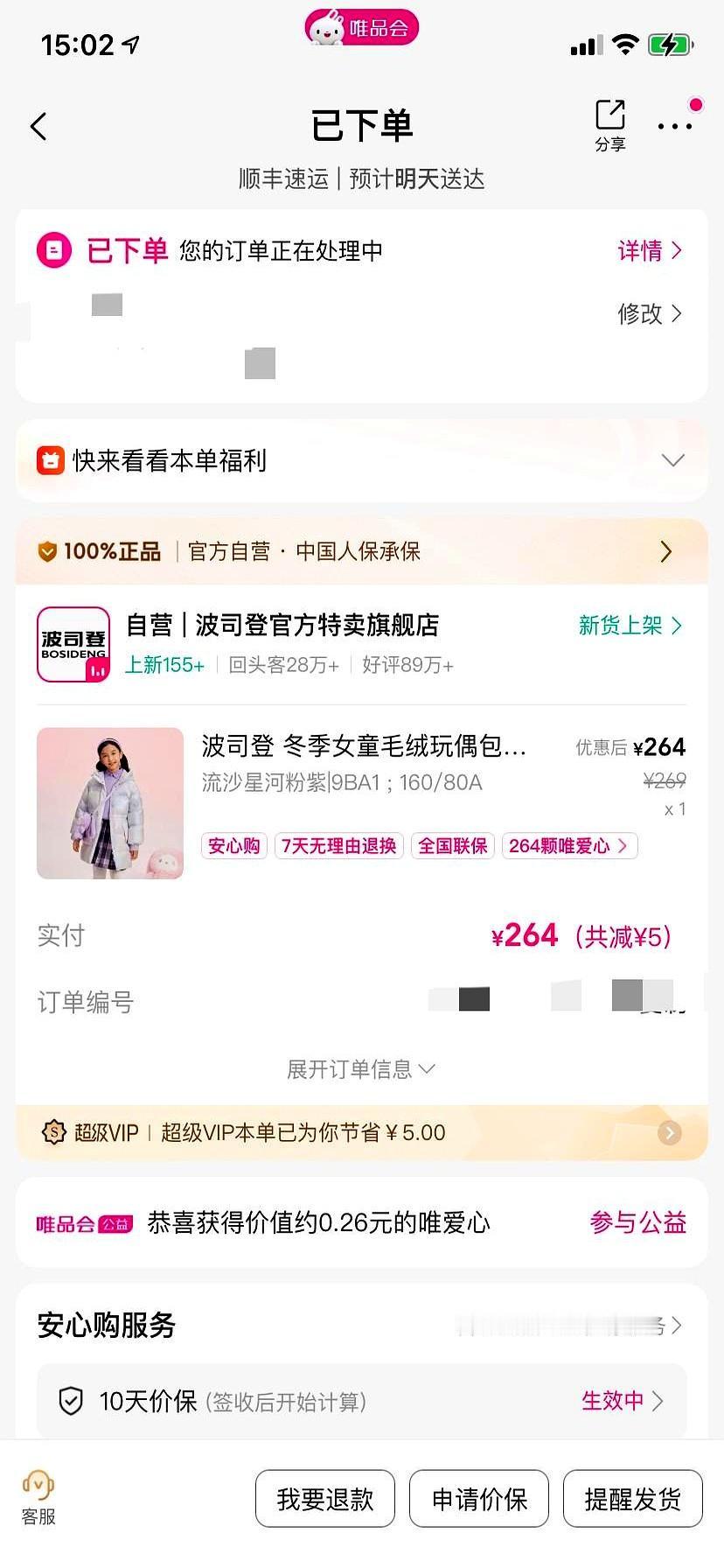 264拿下波司登,省30块 真事。 昨晚上我蹲唯品会闪购,160码的波司登羽绒服结算264,比之前292还便宜30。 差价不多,心里却像白捡钱。 店里同款四位数,线上直接腰斩。 不是我胆子大,是平台套路简单:品牌库存直发,省掉商场租金、导购提成,折后还能叠券。 冬天越冷,唯品会越狠,今年直接干到199起步,我挑的是299那档,充绒86克,通勤够用。 有人嫌克数低,可0℃穿它套卫衣不冷。 真到零下十度,200克也顶不住,还得靠大衣叠穿。 轻薄款赢在轻便不臃肿,地铁里不捂汗。 年轻人早算明白:羽绒服不是传家宝,一年穿仨月,买贵等于给商场交暖气费。 折扣大牌满足面子也保住钱包,这才是理性过冬。