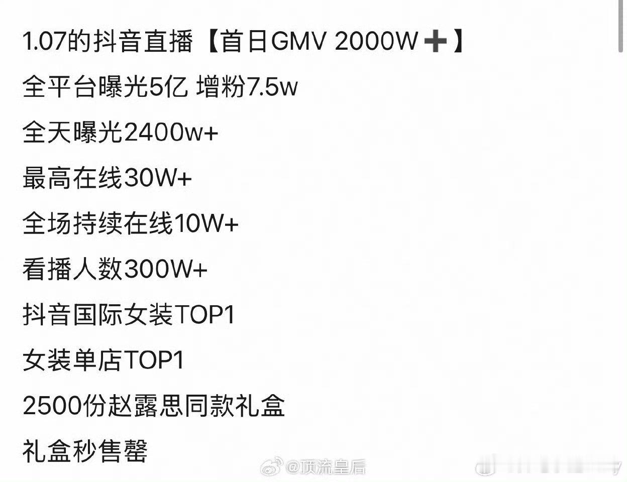 赵露思1月7号小熊直播官方战报来了,当日GMV破2000w+,全平台曝光5亿+,涨粉7.5w,看直播人数300w+,礼盒秒被售空,抖🎶国际女装top1,女装单店top1,年冠爆剧🌸的商业价值太顶了!
