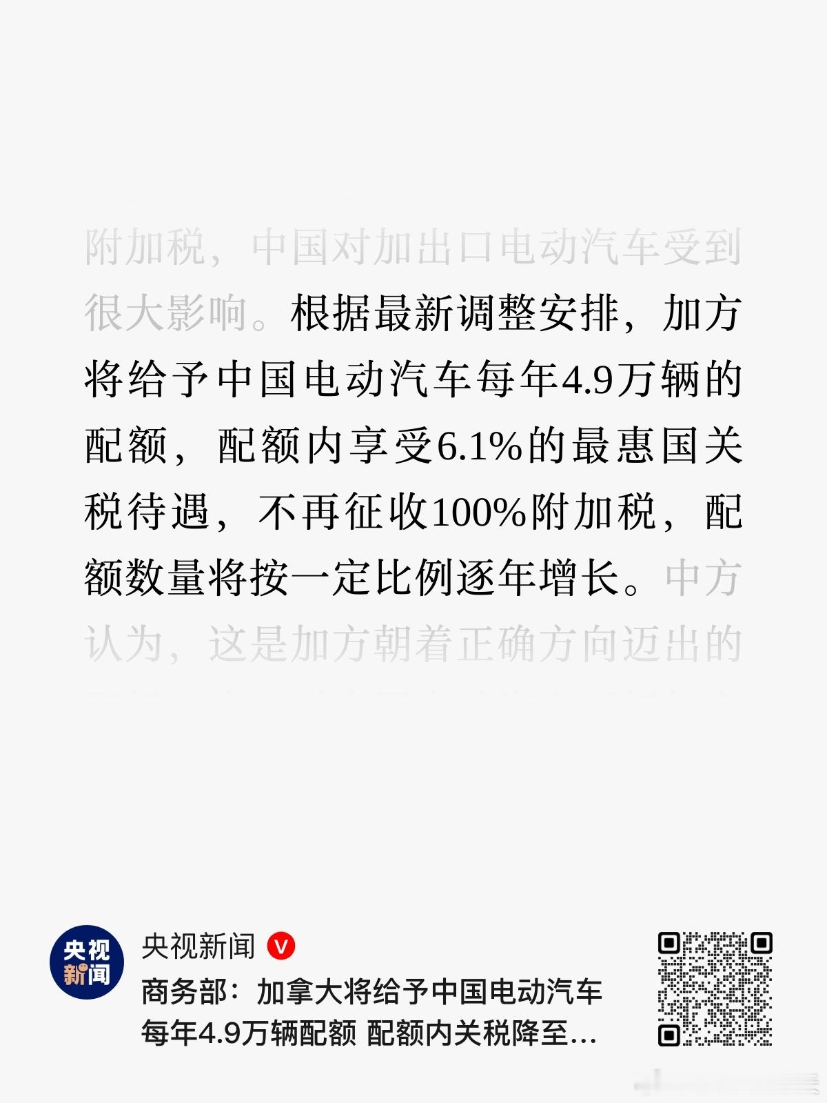 加拿大这波还是可以的~放了4.9万辆的配额,占全年销量大概2.5%(年销量约190万辆),关键数量还会逐渐增长,算是个很好的信号~不过加拿大挺冷的就是,是不是出些增混车合适一点?商务部回应中国电动汽车对加出口细节霸天资讯加拿大将进口4.9万辆中国电车
