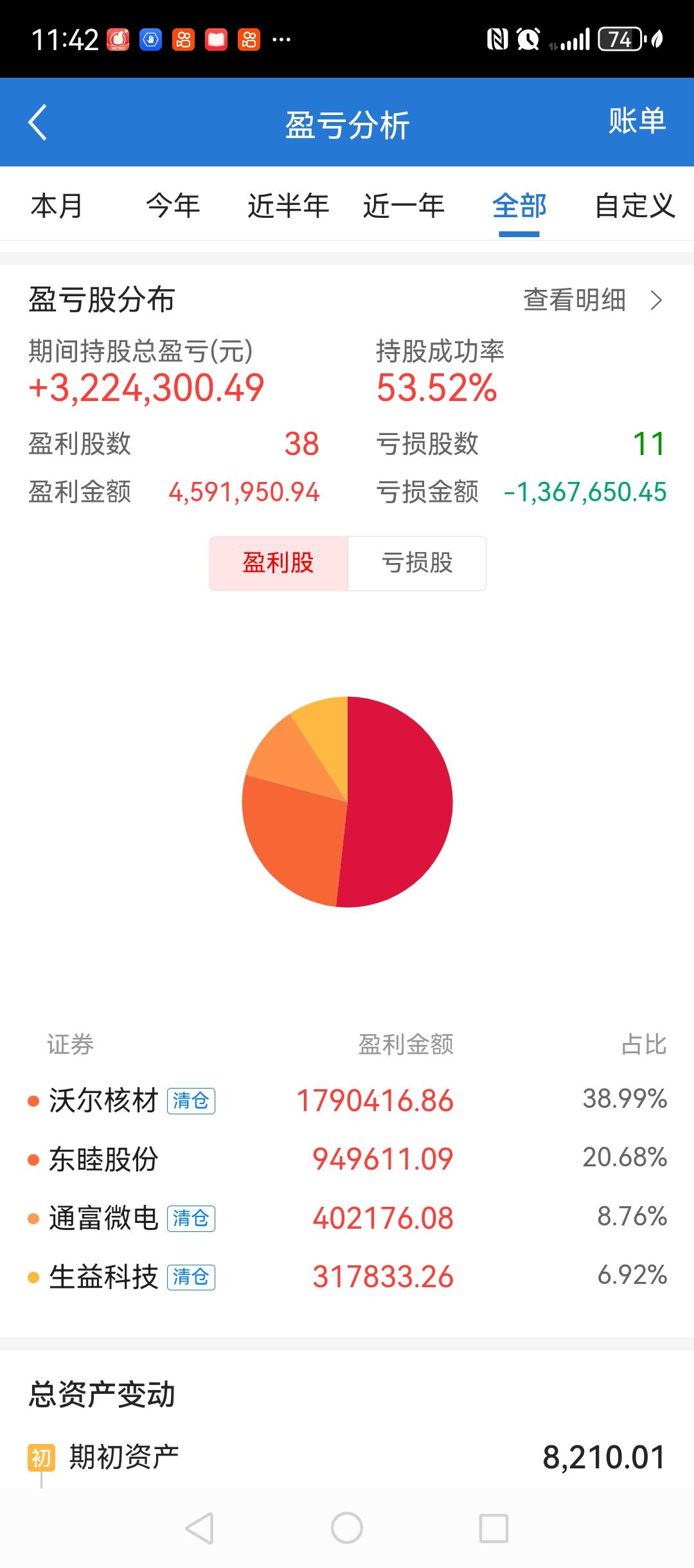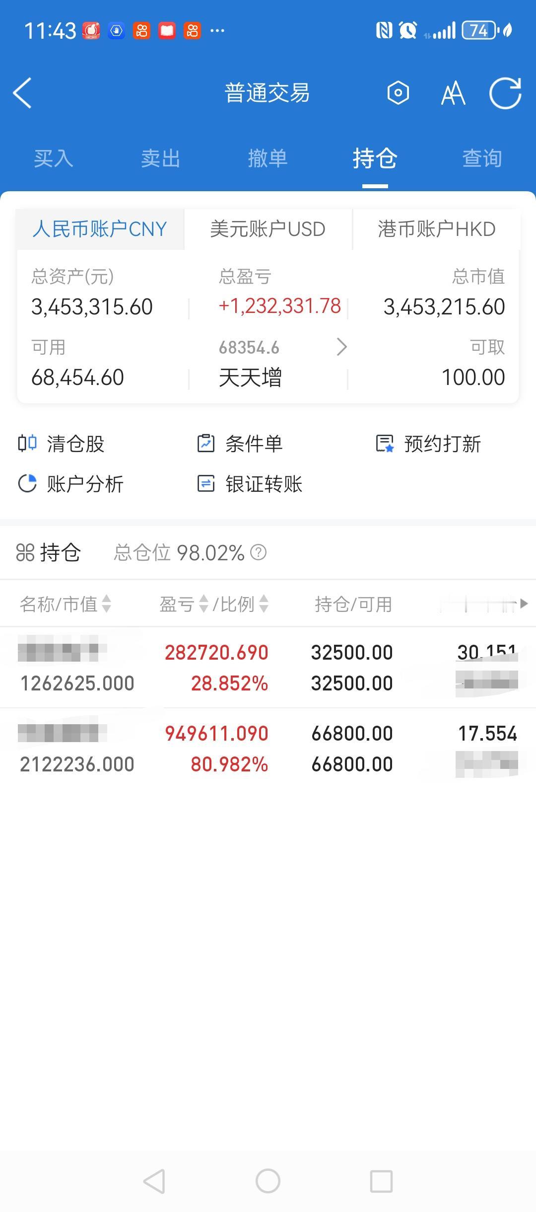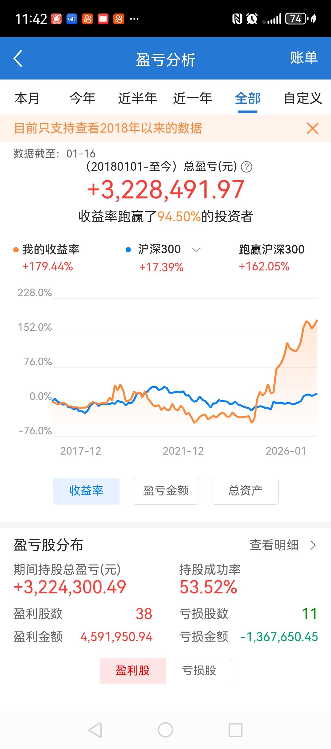 账户的总体收益是180%,昨天刚创了历史新高,赚了320万左右。收益率一般,收益金额不小。! 最难得的是,2021年9月份之后,账户再没有出现过亏损的买卖。股票在卖出的时候都是赚钱的。你所看到的亏损曲线都是2021年9月份之前造成的。 2021年到现在,其实真正的买卖加起来也就那么5次,5次都赚钱了。 现在账户上持有两个股票,一个是电子元器件板块的,另外一个是人形机器人板块的,持有时间都不短了。 我的理念是,好价钱买入好股票,不赚钱不卖,甚至不赚大钱不卖。