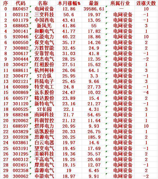 电网设备概念,一月以来涨幅最多的30名单汇总一览 三变科技:+50.60%,最新价 19.97元,连涨 -1天 中国西电:+43.41%,最新价 13.05元,连涨 -1天 新风光:+41.86%,最新价 55.00元,连涨 3 天 和顺电气:+41.77%,最新价 17.82元,连涨 1 天 亿能电力:+40.22%,最新价 18.86元,连涨 10 天 保变电气:+35.17%,最新价 14.26元,连涨 2 天 万胜智能:+32.45%,最新价 24.90元,连涨 2 天 安靠智电:+31.03%,最新价 41.80元,连涨 -1天 双杰电气:+28.25%,最新价 12.35元,连跌 2 天 红相股份:+27.51%,最新价 15.62元,连涨 1 天
