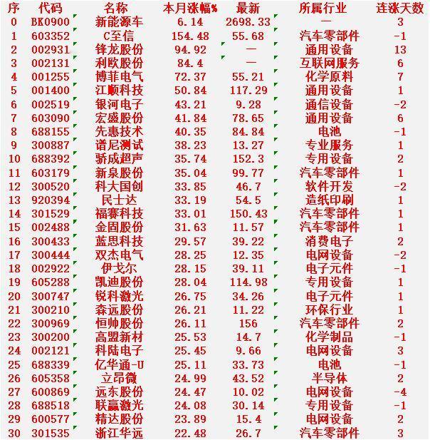 新能源车概念,一月以来涨幅最多的30名单汇总一览 C至信:+154.48%,最新价 55.68元,连涨 -1天 锋龙股份:+94.92%,最新价 暂缺,连涨 13 天 利欧股份:+84.40%,最新价 暂缺,连涨 6 天 博菲电气:+72.37%,最新价 55.21元,连涨 7 天 江顺科技:+50.84%,最新价 117.29元,连涨 1 天 银河电子:+43.21%,最新价 9.28元,连涨 -2天 宏盛股份:+41.84%,最新价 78.65元,连涨 6 天 先惠技术:+40.35%,最新价 84.84元,连涨 -1天 谱尼测试:+38.23%,最新价 13.27元,连涨 1 天 骄成超声:+35.74%,最新价 152.30元,连涨 2 天