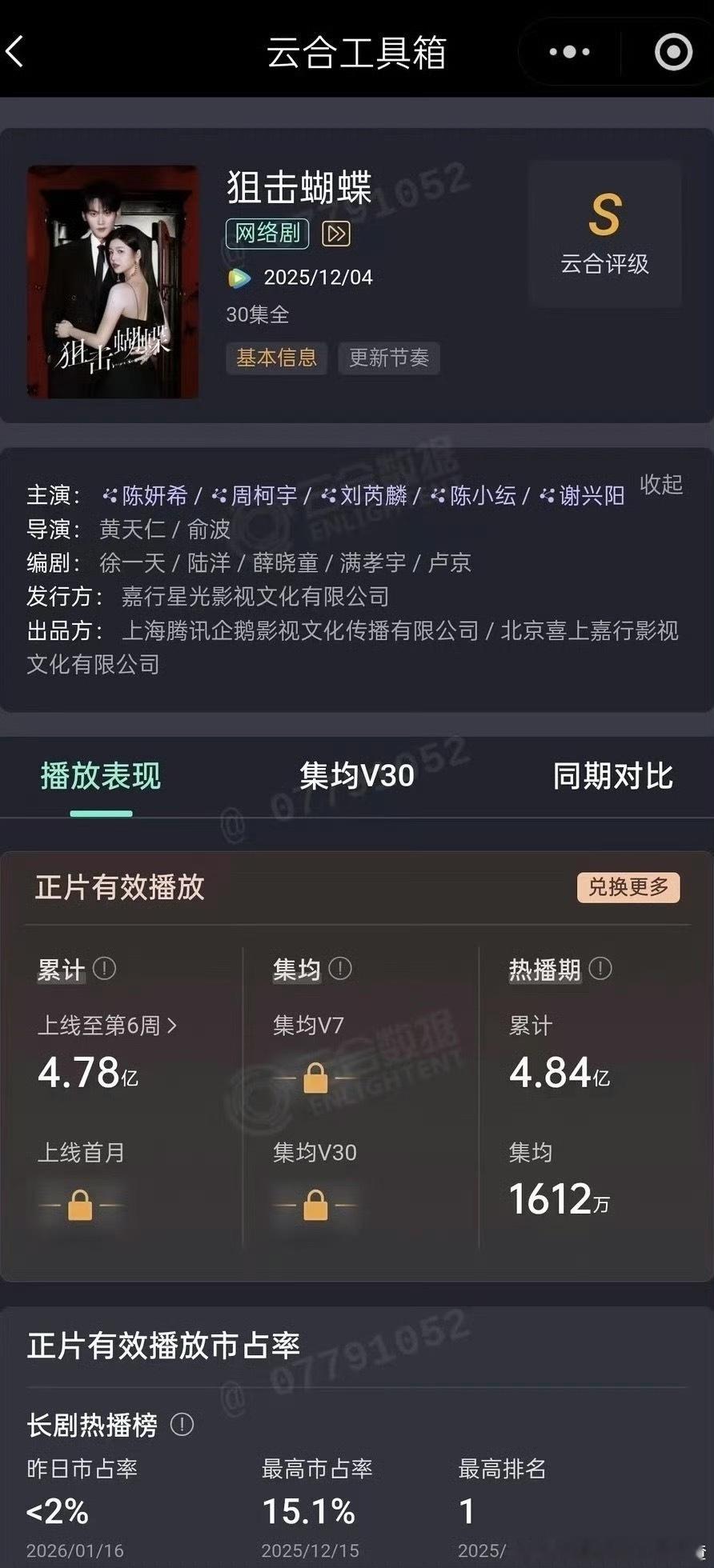 陈妍希周柯宇《狙击蝴蝶》热播期结束,最终集均1612万。 狙击蝴蝶集均1612万