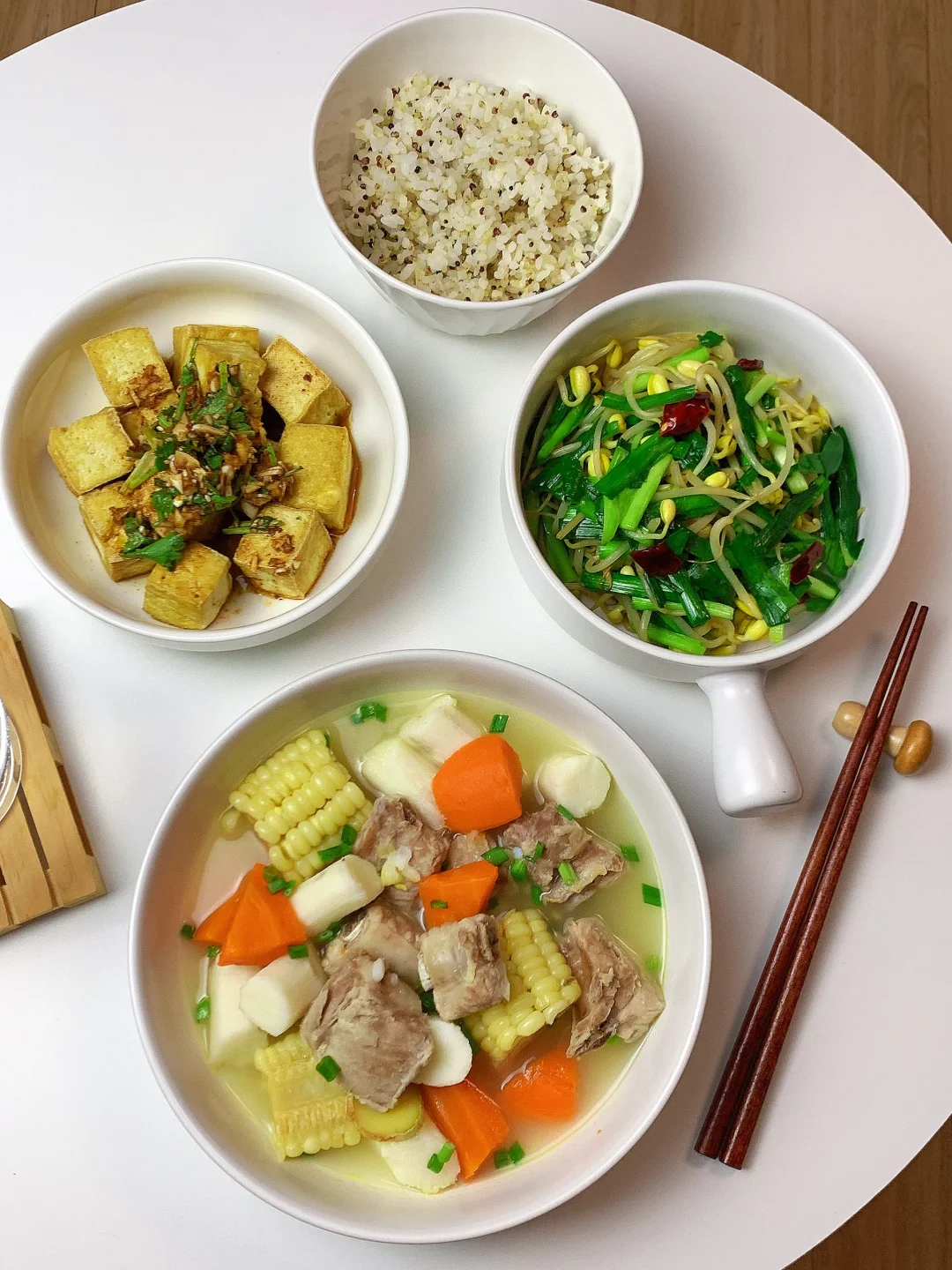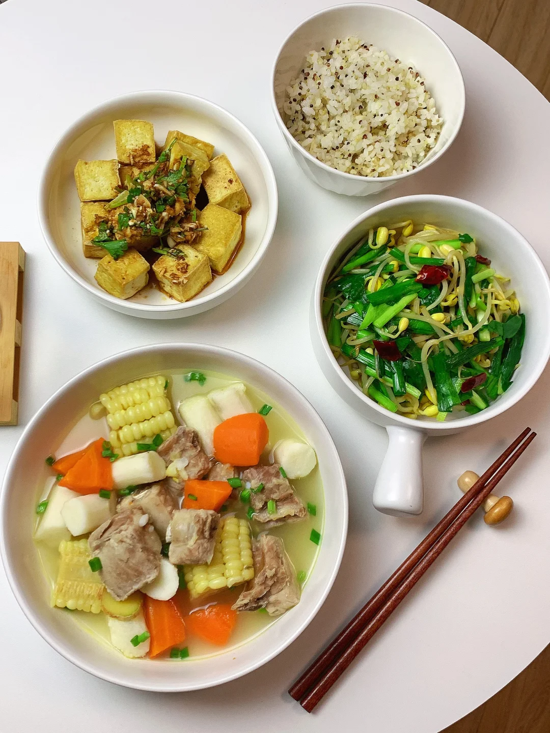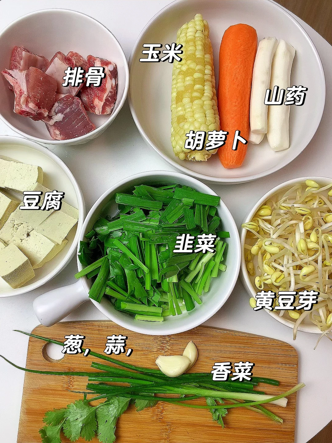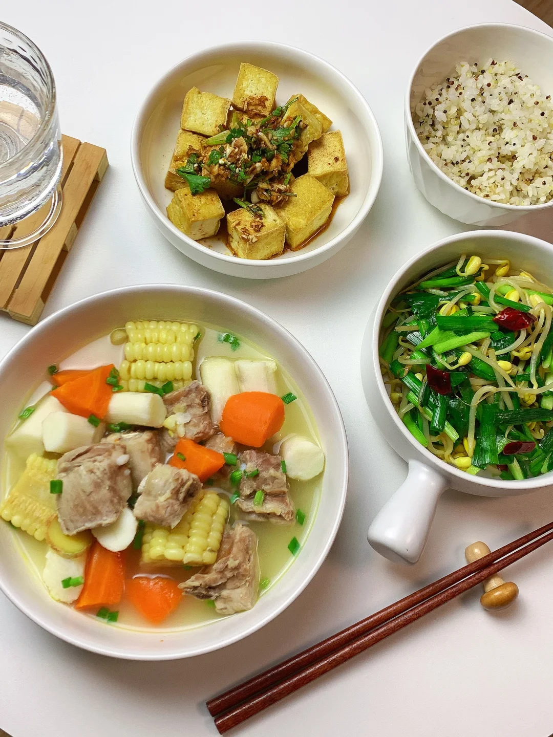 👩🏻🍳分享今日菜单 [一R]韭菜炒豆芽 [二R]浇汁豆腐 [三R]山药玉米排骨汤 主食:米饭🍚 ……………………………………………………………………………… 🛒食材清单: 排骨 | 玉米🌽 | 山药 | 胡萝卜🥕 | 黄豆芽 | 韭菜 | 豆腐 | 香菜 ~ 📝我的美食日记,一日三餐,拒绝外卖[偷笑R],坚持做饭的每一天,吃简单干净的饭菜~ ₍˄·͈༝·͈˄*₎◞ ̑̑