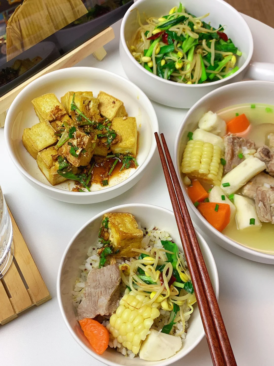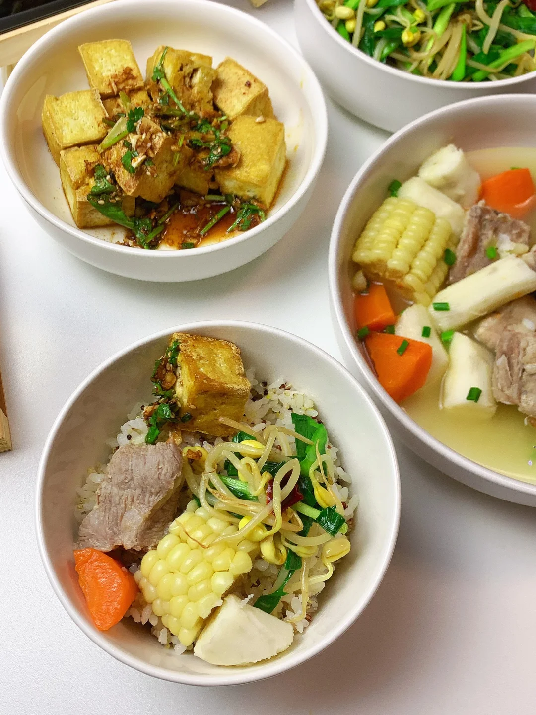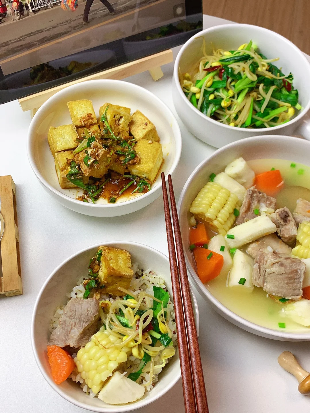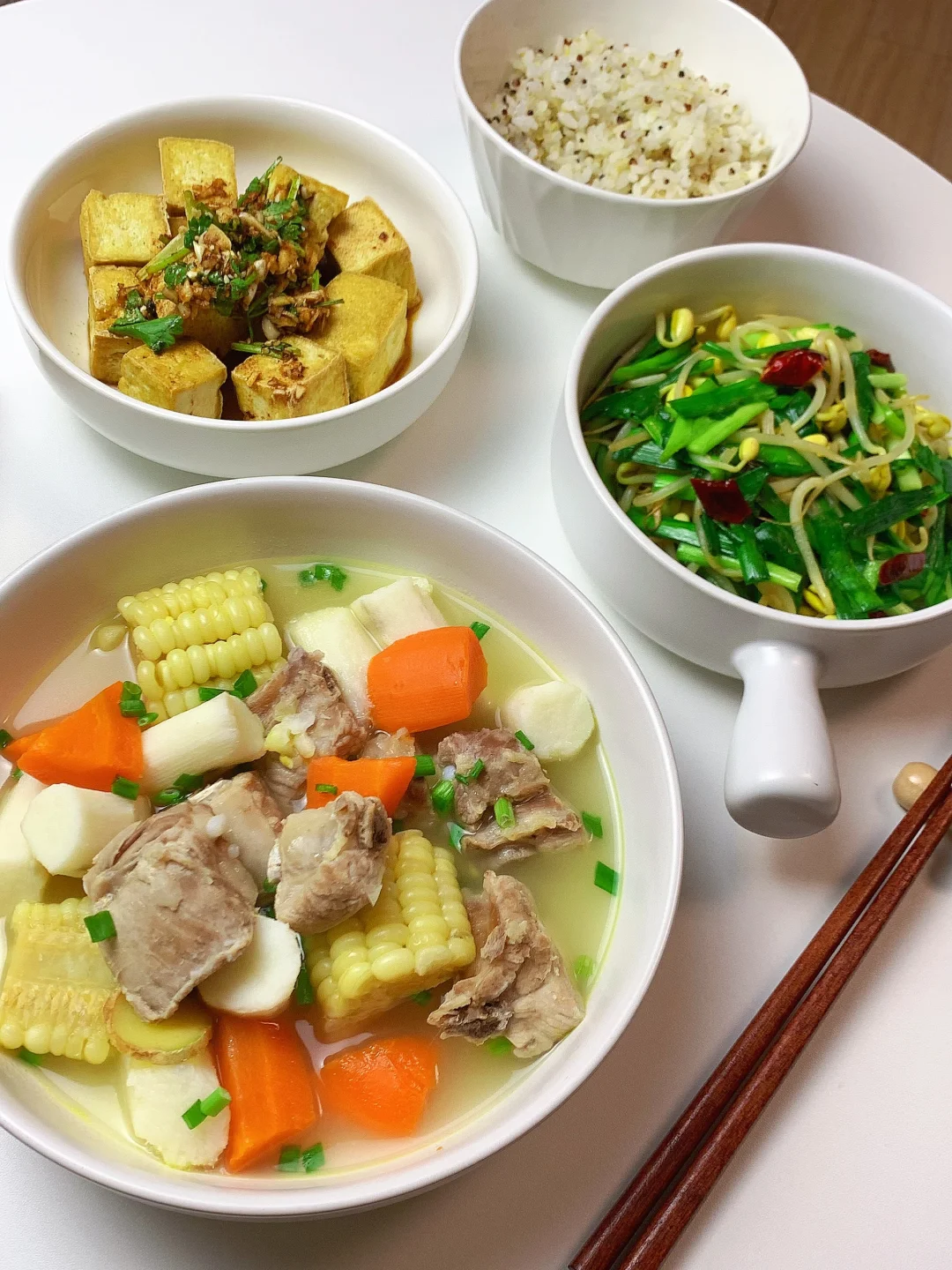 👩🏻🍳分享今日菜单 [一R]韭菜炒豆芽 [二R]浇汁豆腐 [三R]山药玉米排骨汤 主食:米饭🍚 ……………………………………………………………………………… 🛒食材清单: 排骨 | 玉米🌽 | 山药 | 胡萝卜🥕 | 黄豆芽 | 韭菜 | 豆腐 | 香菜 ~ 📝我的美食日记,一日三餐,拒绝外卖[偷笑R],坚持做饭的每一天,吃简单干净的饭菜~ ₍˄·͈༝·͈˄*₎◞ ̑̑