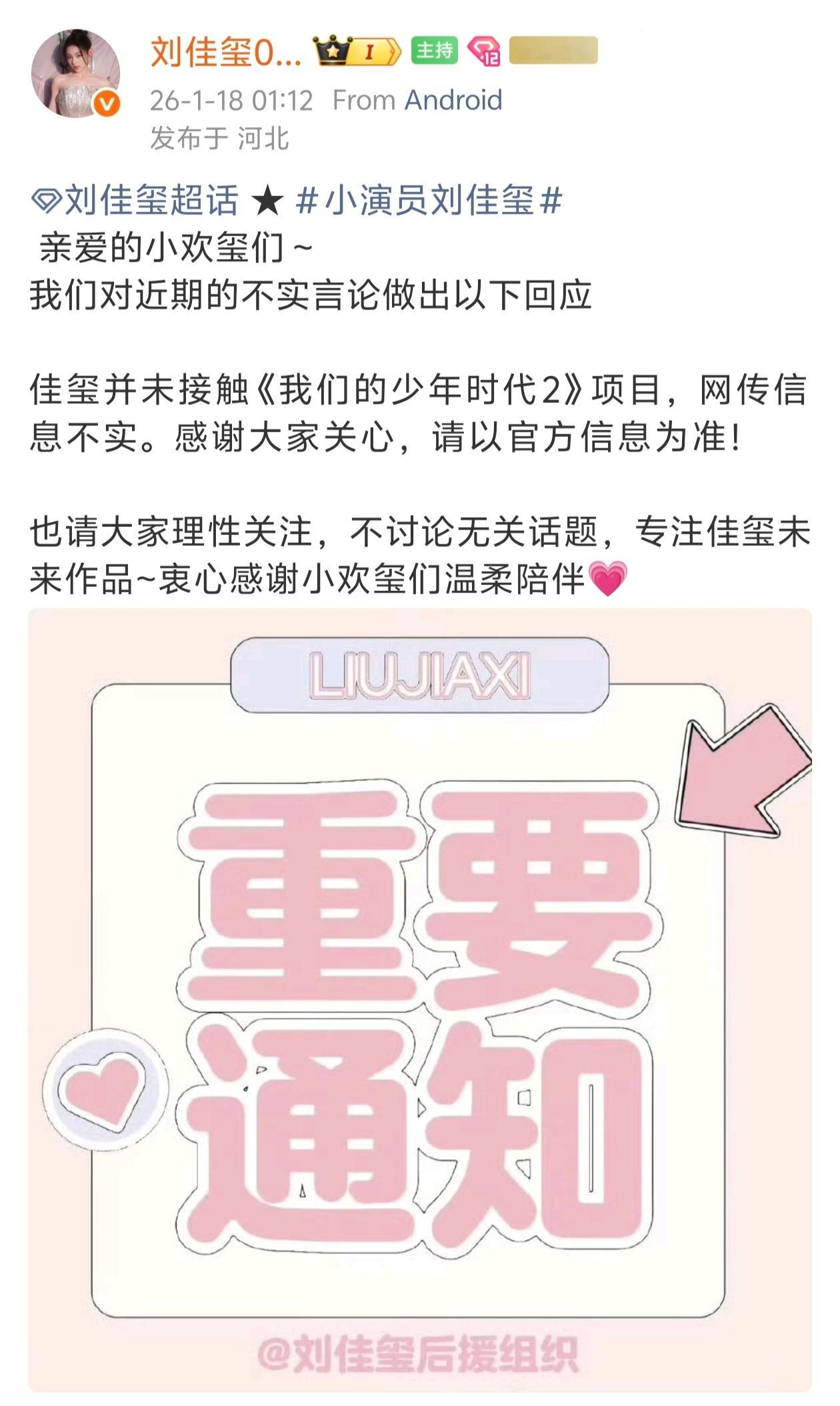 🎀网传要参演四代新剧的女演员辟💊了刘佳玺后援会否认出演我们的少年时代2