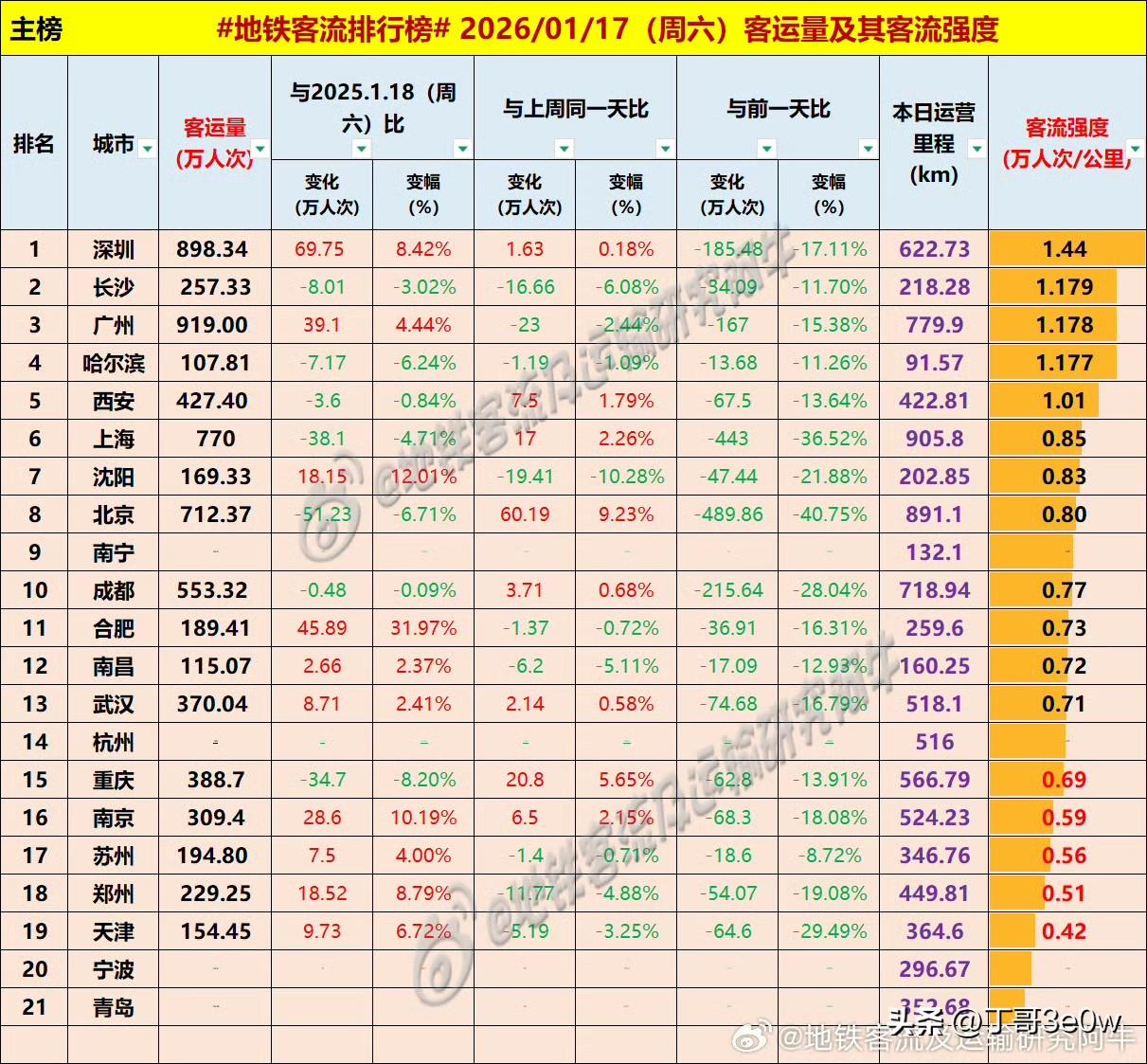 广州地铁客流量周六达919万人次,昨日唯一超900万的城市[呲牙][呲牙][呲牙] 爆料 身边事 客流 地铁客流排行榜 昨日客流 排行榜 周六 广州 2026年1月17日 星期⑥ 全国重点城市轨道交通客流量排行榜: 广州:919.00万广州身边事 深圳:898.34万 上海:770.00万 北京:712.37万 成都:553.32万 西安:427.40万西安 重庆:388.70万重庆身边事 武汉:370.04万 杭州:309万+杭州身边事 南京:309.40万南京爆料 长沙:257.33万 郑州:229.25万郑州地铁 苏州:194.80万苏州身边事 合肥:189.41万 沈阳:169.33万沈阳爆料 天津:154.45万天津地铁 南昌:115.07万南昌地铁 青岛:107万+ 宁波:107万+宁波身边事 哈尔滨107.81万哈尔滨爆料 南宁:100万+