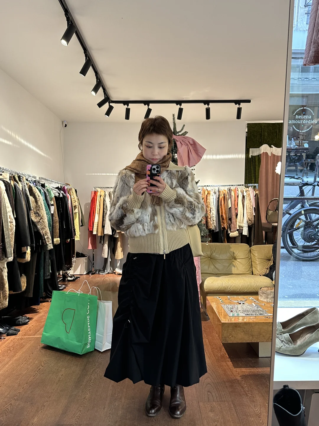 路过偶尔发现的宝藏店!之后走了一下午,这次都没有发现比这家选品好的(我感觉每家的选品如何也看时间点和季节性)我淘到了兔毛皮草和doir真丝羊毛吊带。淘到了人生蛇皮西装,闪亮美丽。我们购入的几件成色都太好了点,感觉几乎没有穿过!店里还有让我们念念不忘的ysl貂和真丝衬衫。总之在玛黑想买优质vintage,还得多走走。