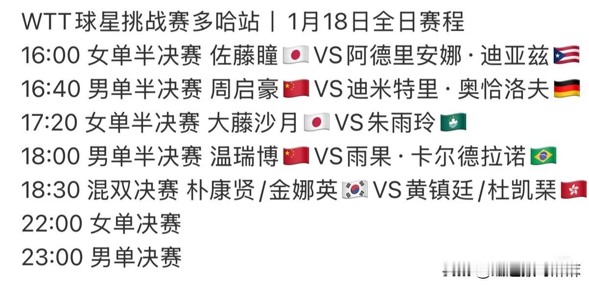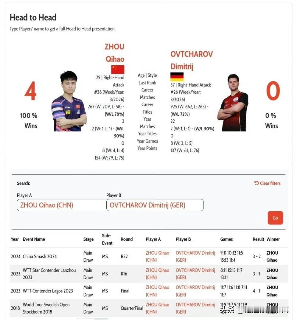 多哈球星挑战赛,国乒男队有俩人晋级四强,女队一个进四强的都没有,还真是浪潮退去,才知道谁在luo泳![捂脸] 女队的单打,女双和混双全都颗粒无收了。 男队,这次周启豪和温瑞博晋级单打四强,黄友政和温瑞博的男双昨晚获得亚军🥈,至少已经获得一枚奖牌。 今天的两场单打,一场比一场难打。 周启豪VS奥恰洛夫的头对头交手记录,周启豪🇨🇳4比0奥恰洛夫🇩🇪 2025WTT中国大满贯:周启豪3比2奥恰洛夫(-9,-10,5,13,4) 2023WTT兰州球星挑战赛:周启豪3比1奥恰洛夫(-8,13,7,11) 2023WTT拉各斯常规挑战赛:周启豪4比1奥恰洛夫(7,6,8,-7,7) 2018年国际乒联瑞典公开赛:周启豪4比1奥恰洛夫(9,7,-9,9,6) 虽然是全胜记录,但是也可以看出,奥恰越来越难打,最近的交手是去年的中满,打到了决胜局才分胜负。 今天两人也是打到了2-2,又是打到决胜局,还好决胜局顶住了,恭喜七号3-2战胜奥恰晋级男单决赛![奋斗] 小温和雨果这场也是硬仗,小温拼就是了,加油![奋斗]