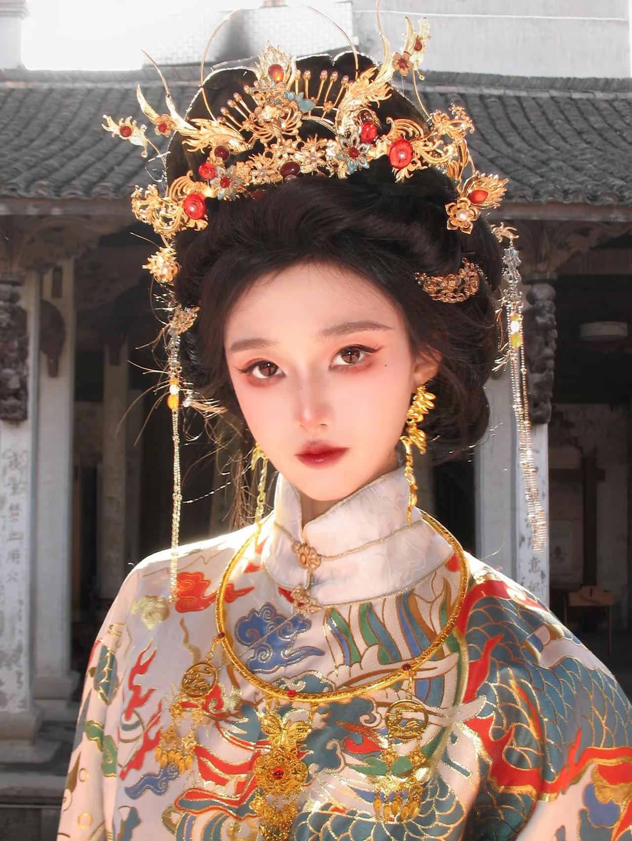 《蝶恋花·红妆雪鹿》 红袄金簪妆雪境,裘领堆霞,艳压枝头杏。 轻抚麋茸凝睇静