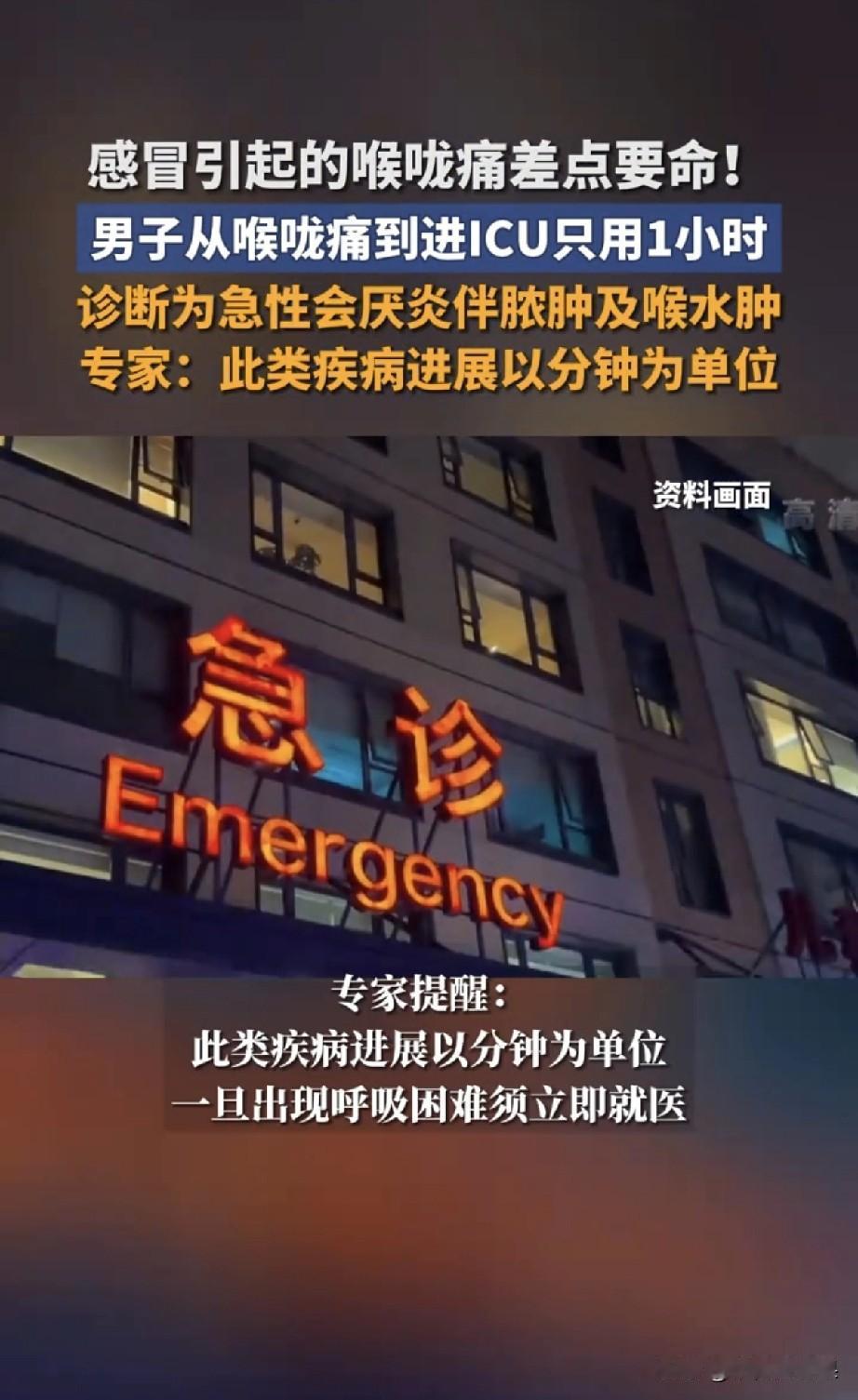刚刷到一个新闻,直接吓得我从床上弹起来!西安一个大哥,前一天还好好的,只是喉咙有点疼,想着忍忍就过去了,结果短短60分钟,就从‘有点疼’变成了‘喘不上气’,家人送急诊后被抬进了ICU!医生说,再晚来几分钟,人就没了!到底是什么病这么凶?!” 医生诊断是急性会厌炎,还伴随脓肿和喉水肿。 简单来说,就是喉咙里有个叫“会厌”的小盖子发炎肿成了气球,直接把气管堵死了,几分钟就能窒息! 专家说这种病进展速度以分钟计算,死亡率极高,冬春季节高发,一旦出现呼吸困难须立即就医!”