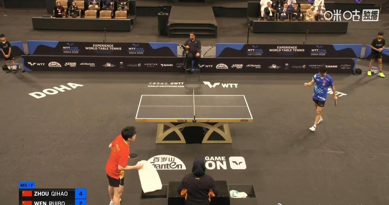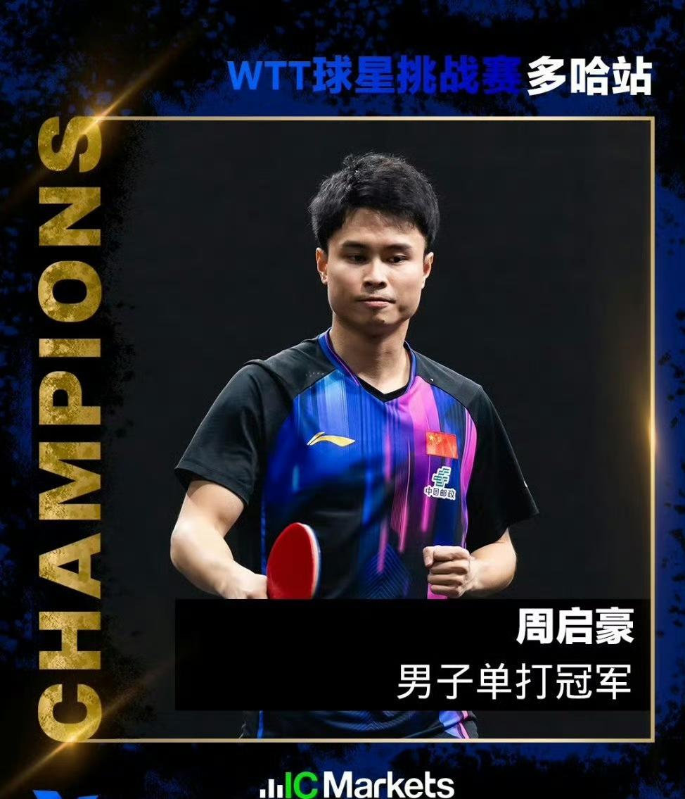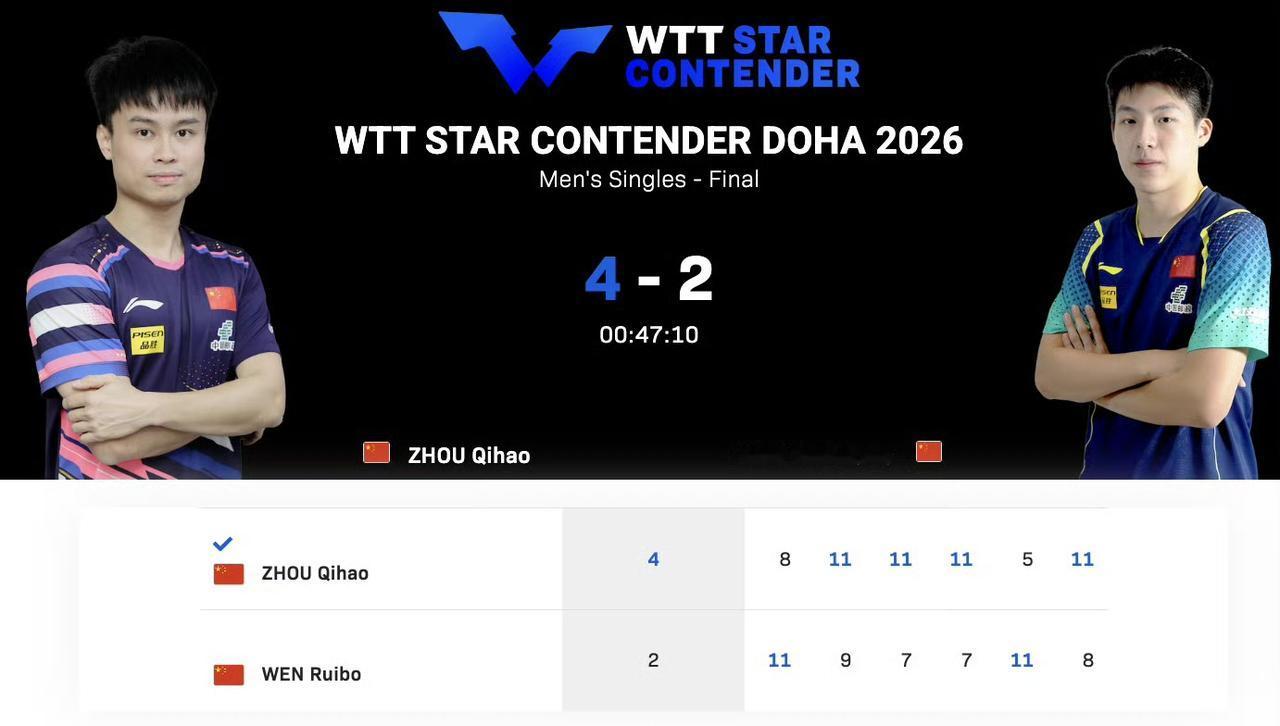周启豪🇨🇳夺冠[赞]! 温瑞博🇨🇳亚军[赞]! 国乒收获2026新年第一冠! 出门了半个月的国乒大部队,今日凌晨终于开张了,周启豪🇨🇳4-2战胜温瑞博🇨🇳,斩获2026WTT球星挑战赛多哈站男单冠军,六局比分为:8-11,11-9,11-7,11-7,5-11,11-8。 还真是,七号神经刀一开,鬼刀也没辙[捂脸],小温夺得亚军还摘了果子(复仇雨果🇧🇷)已经很棒了。 一个冠军到手,周启豪的世界排名就来到第23位了, 能去参加大满贯和冠军赛了[赞]。 国乒开年第一冠,周启豪开了个好头,希望国乒今年能有好的收成[奋斗]!