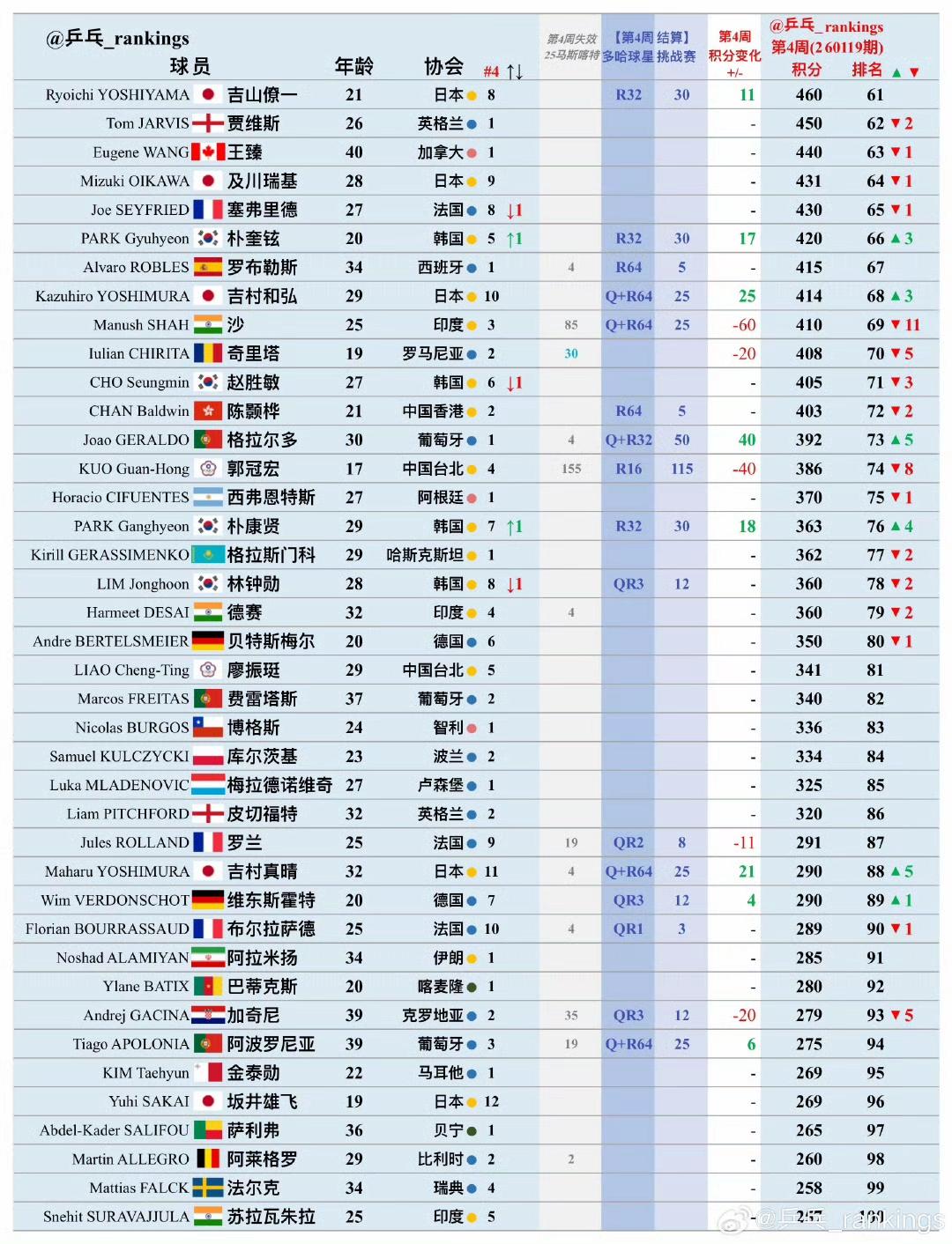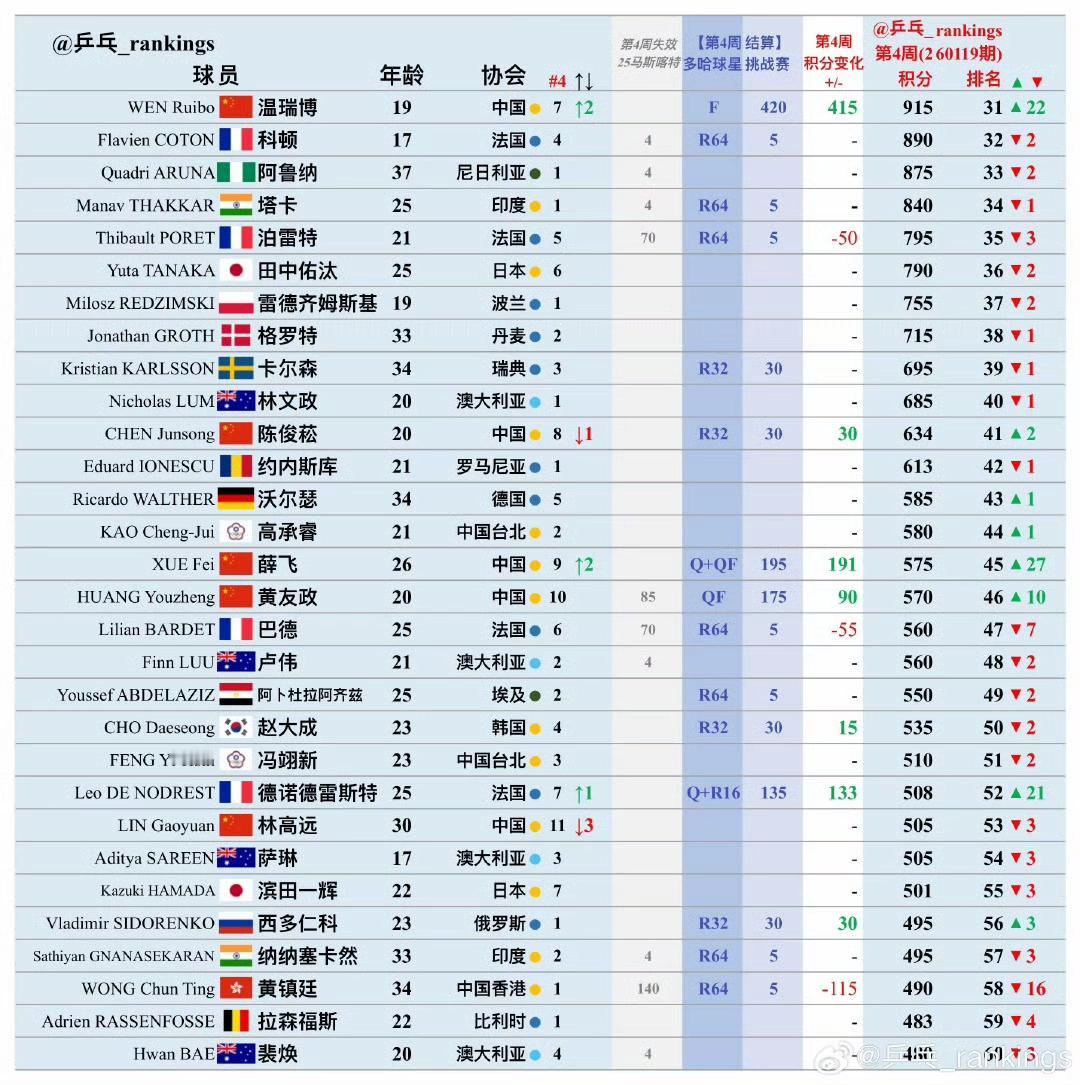 周启豪🇨🇳世界排名升至第23位[赞]! 国际乒联2026年第4周男单项目世界排名如图所示。 本周世界排名积分加上了刚刚结束的 2026WTT球星挑战赛多哈站的积分,去年的WTT常规挑战赛马斯喀特站积分失效。 本周世界排名上,王楚钦、林诗栋依然以较大优势排名前二位,雨果🇧🇷比林诗栋少了1475分排在第三位。莫雷加德🇸🇪第四位,张本智和🇯🇵排在第五位。 新晋球星挑战赛冠军周启豪🇨🇳上升13个位次超越陈垣宇🇨🇳来到第23位,占据了国乒男单五号位[赞]。 陈垣宇下降六个位次来到了第29位。 (感谢乒乓rankings的图片)