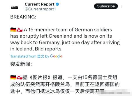 1月18日,根据德国图片报报道,一支由15名士兵组成的德国小分队在抵达冰岛仅一天后,便突然宣布撤离格陵兰岛,目前正启程返回德国。 这支小队的出发本就一波三折。最初德国国防部说派13名士兵,后来又追加了两名技术专家,凑齐15人。原定于15日出发,结果推迟到16日才登岛,比计划晚了整整一天。 他们来这儿的目的,是跟着丹麦主导的“北极耐力”联合行动,考察极地环境能不能部署战斗机、护卫舰,顺便评估海上巡逻机的演习可行性,本质就是和其他欧洲国家一起,在格陵兰岛亮个相,彰显对北极地区的关注。 和德军一起行动的还有法、瑞、英等六个欧洲国家,加起来总共才37人。这点兵力别说实际防御,连意大利防长都忍不住调侃,说这规模像段子的开头。 要知道,格陵兰岛本身就有150名丹麦军警驻守,还有200名美军驻扎,欧洲联军这点人,象征意义远大于实际作用。可即便只是表态,也戳中了美国的敏感神经。 1月17日,美国总统特朗普在社交平台上放出狠话,要从2月1日起对德国、丹麦等八个派兵国家加征10%的输美关税,到6月还要涨到25%,直到这些国家同意美国“购买”格陵兰岛。 这话不是随口说说,特朗普政府自2025年上任后,就多次惦记着格陵兰岛,不光想花钱买,还暗示过可能动武。 格陵兰岛之所以被美国盯上,核心就是它的战略价值。作为世界最大岛屿,它卡住了北极航道的关键节点,周边藏着全球30%未开发的油气资源和稀土矿产,格陵兰、冰岛、英国之间的“GIUK缺口”,更是美俄海军进出大西洋的必经之路。 对德国来说,美国的关税威胁可不是小事,汽车、机械制造这些德国支柱产业,对美国市场依赖度极高,真要是加税,出口下滑、就业受影响都是连锁反应。 德军撤离时的场景和登岛时截然不同。登岛时还公开亮相,撤离时却全程低调沉默,在机场候机时也不与人交流。原本定好中午起飞的航班,因为飞机需要除冰还延误了一阵,士兵们就静静等着,没人多说一句话。德国联邦国防军后来发声明,说任务“按计划圆满完成”,之所以提前走,是因为恶劣天气取消了去丹麦军事基地的行程。 这个理由显然站不住脚。德国《图片报》直接点破,这场突然撤离更像是对美国关税威胁的回应。毕竟原计划的多国协同侦察、极地适应训练全都没做,所谓的“圆满完成任务”根本无从谈起。 有意思的是,就在撤离当天,德国副总理还公开表态,说不能被美国的政策吓倒,欧盟也在商量启动反胁迫工具应对。 各方的反应也透着微妙。白宫轻描淡写说欧洲派兵不影响美国决策,俄罗斯则密切关注,外交部发言人直言欧洲正自食其果。 格陵兰岛自治政府重申和丹麦站在一起,85%的当地居民都反对并入美国,但这改变不了北极地缘博弈升温的事实。俄罗斯已经借机强化北极核潜艇部署,中美欧俄的利益交织,让这片冰封之地成了新的博弈焦点。 这场44小时的登岛又撤离,说到底是美欧利益失衡的缩影。德国夹在经贸利益和地缘诉求之间左右为难,最终的撤离相当于在跨大西洋同盟上划了一道裂痕。 随着2月1日关税生效日临近,其他欧洲国家会不会跟着妥协还不好说。你觉得德国是被迫妥协还是战略退缩?美欧围绕格陵兰岛的博弈还会升级吗?欢迎在评论区留下看法。