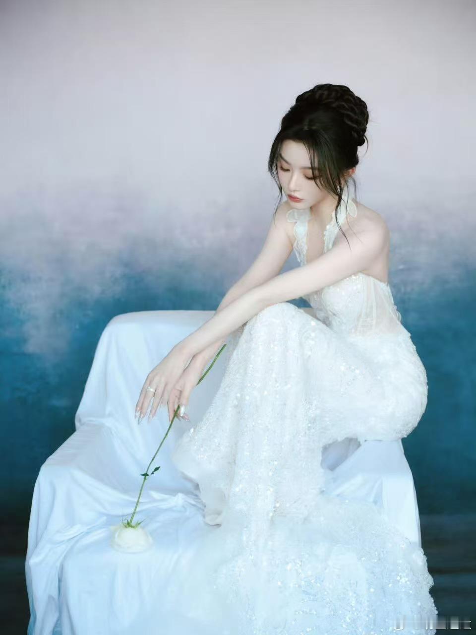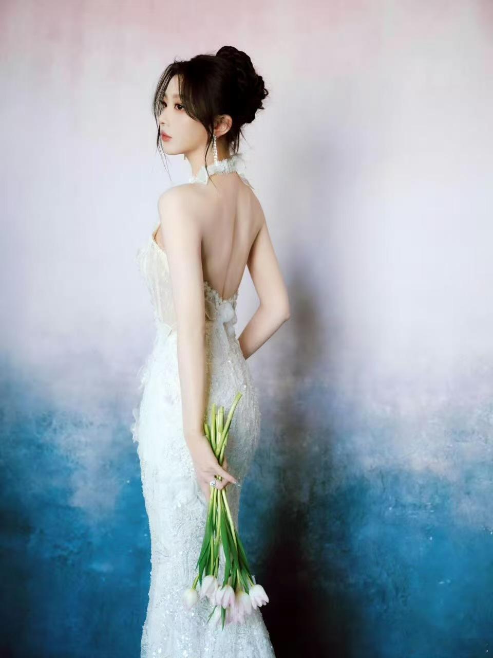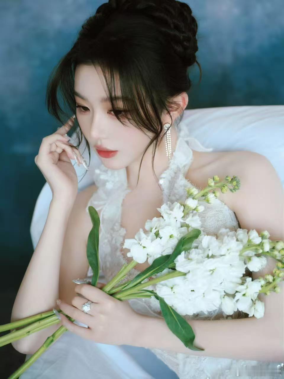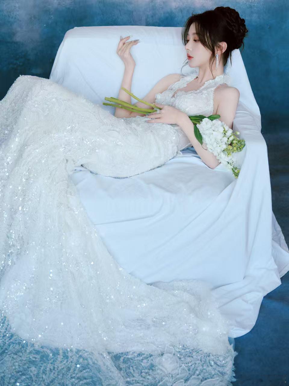 时尚32周年时尚之夜孔雪儿 一袭流光白裙惊艳登场!立体蕾丝缀满星芒,高颅顶盘发搭配灵动耳饰,手捧铃兰斜倚云端,仙气与高级感交织,定格周年盛典高光时刻