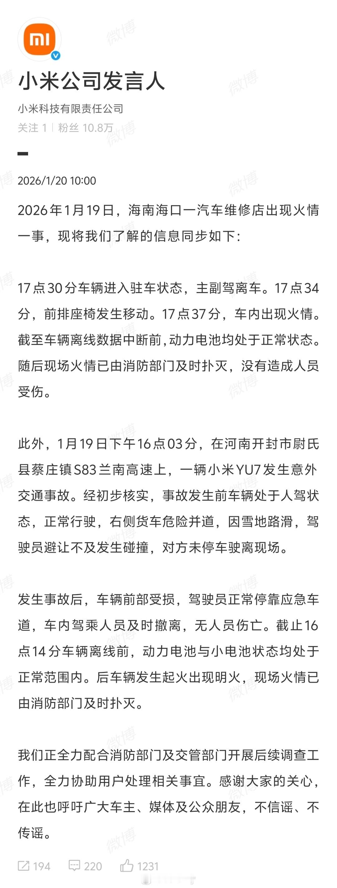 小米通报海南一汽车维修店火情 两起事故省流版:2026年1月19日17时37分,海南海口一维修店内车辆发生火情。此前车辆于17点30分驻车离人,17点34分前排座椅发生移动,直至起火前监测数据显示动力电池状态正常。火情由消防部门及时扑灭,无人员伤亡,公司正配合相关部门调查。同日16时03分,一辆小米YU7在河南开封S83兰南高速因雪地路滑,避让右侧危险并道货车时发生碰撞。驾乘人员及时撤离,无伤亡,车辆离线前电池状态正常。事后车辆前部起火被消防扑灭,公司正协助处理并配合调查。