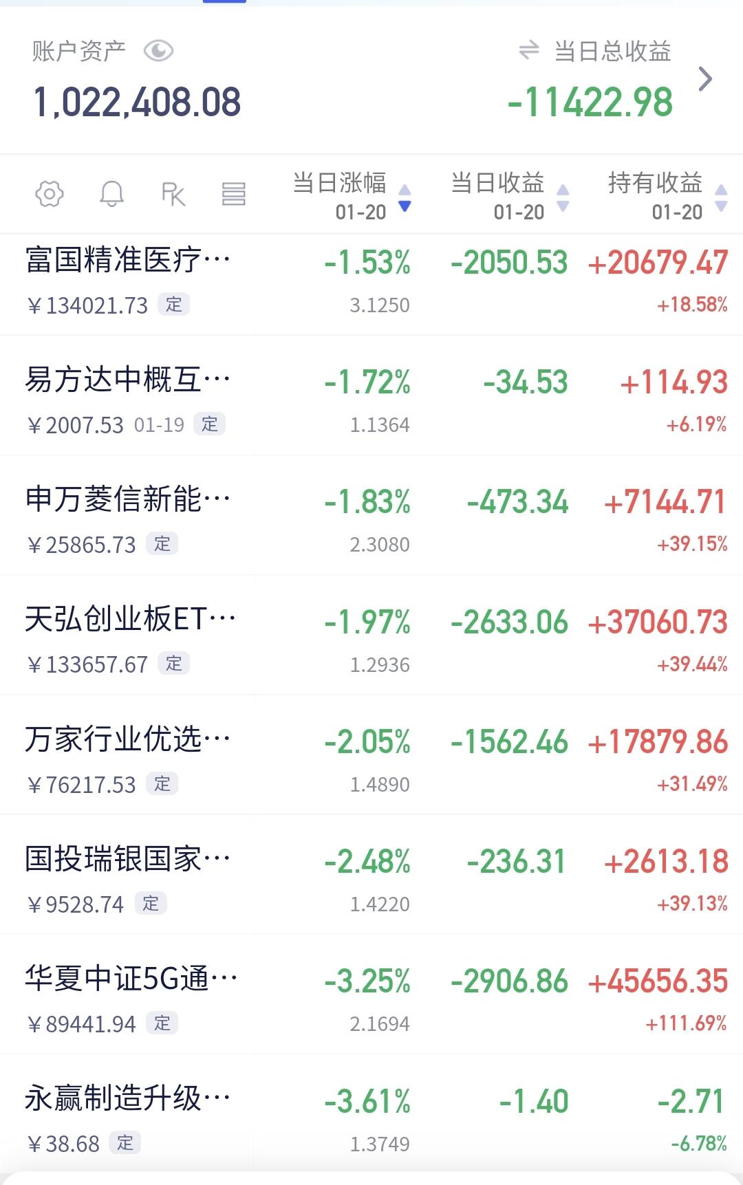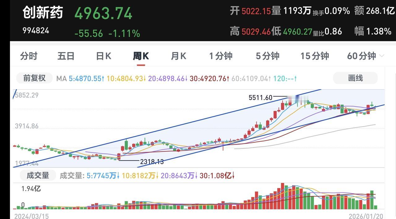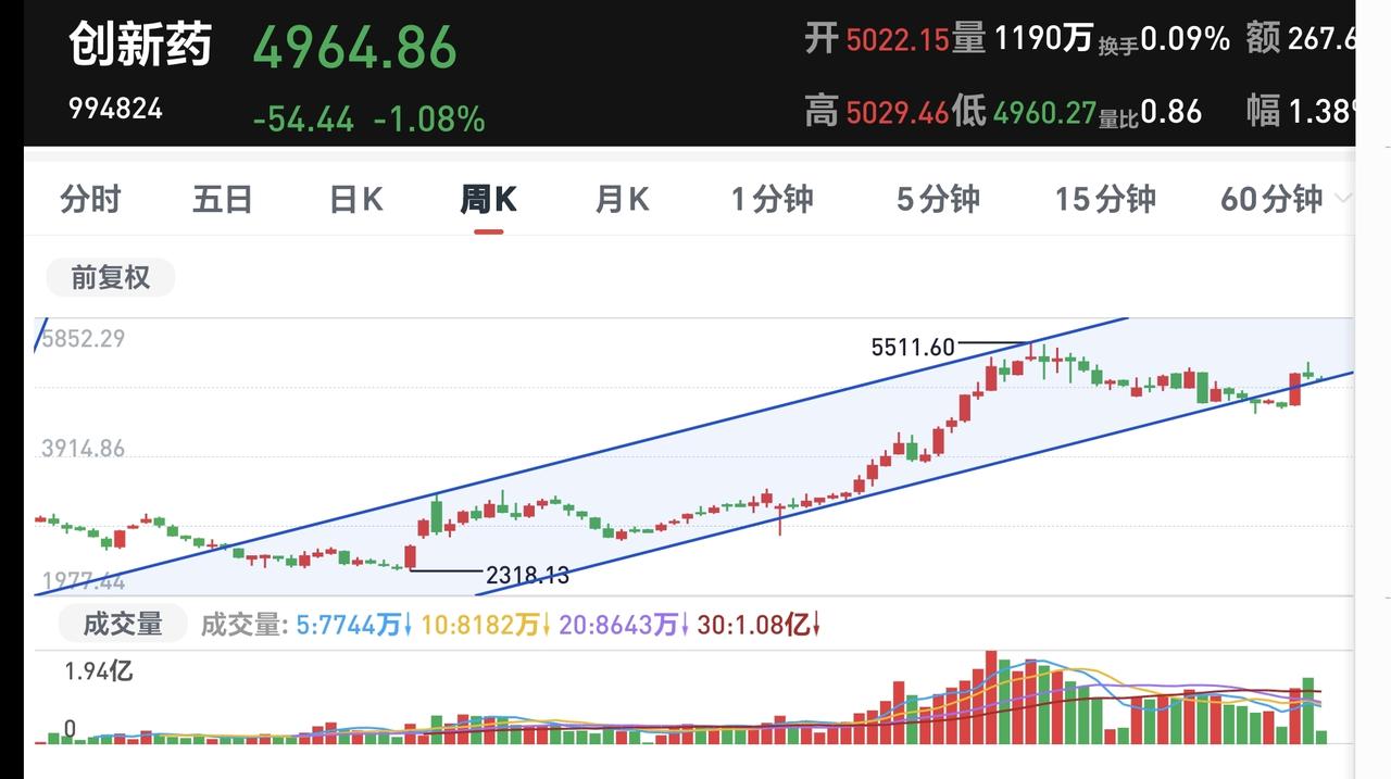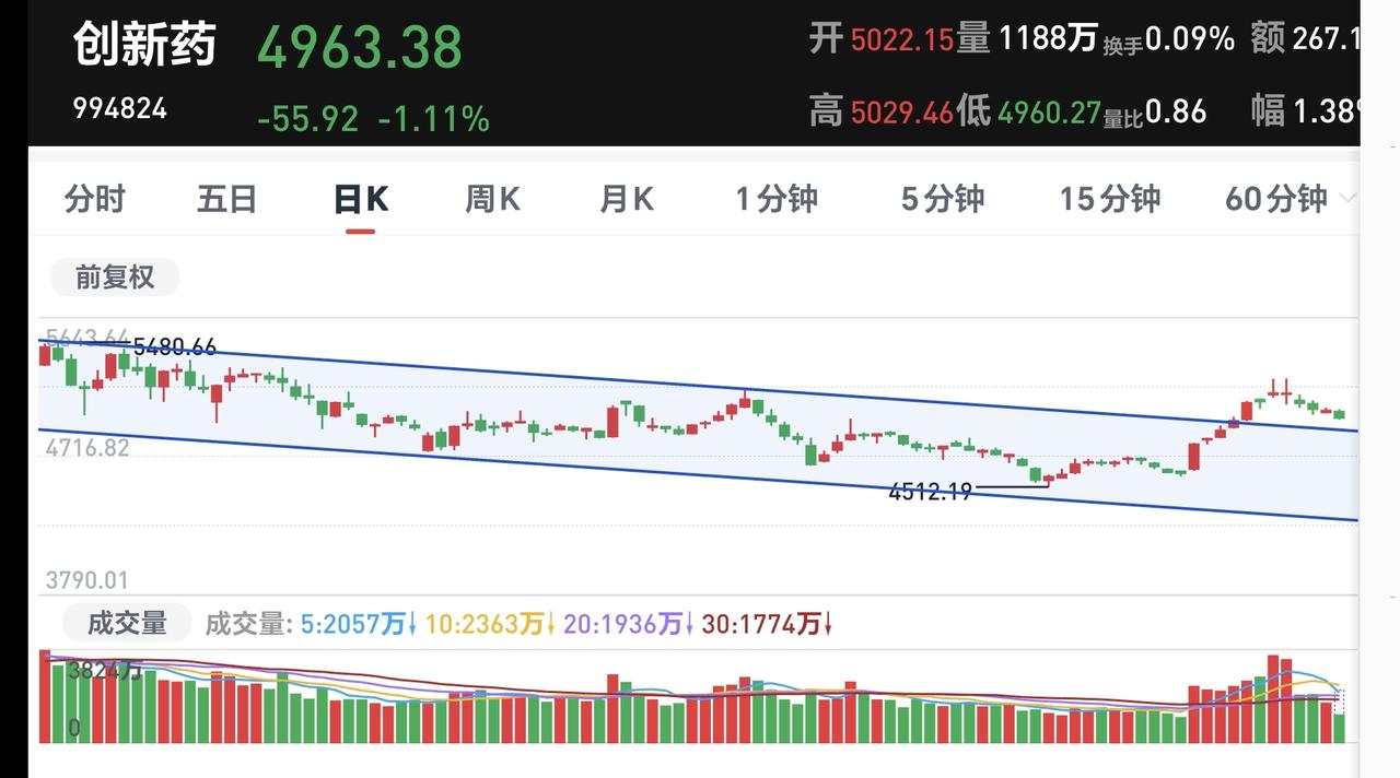 基金:创新药板块应该怎么办 持有的基金中,创新药板块基金富国现在盘中估值下跌了1.53%,超过了创新药板块1.47%的下跌幅度,这个板块是连续第5个交易日下跌,持有人数在所有板块当中排名第8位,散户人数也是不少。 创新药板块今天加仓人数排行榜见下面的截图4,持有人数排行榜见下面的截图5,排名第一的都是永赢医药创新智选混合。 我们来看下面的截图6,这是创新药板块日K线图,从图中可以看出,我画了两条倾斜向下的斜线,这是创新药板块日线级别下跌通道。前段时间上涨突破了这个下跌通道的上轨,也就是说,创新药板块日线级别下跌趋势有可能已经被改变,最近是在回踩确认中,观察会不会重新回到下跌通道中。 我们来看下面的截图7,这也是创新药板块日K线图,从图中可以看出,创新药板块5天线位置是5039点,现在的位置是4963点,已经跌破了5天线的位置,从破位5天线位置的情况看,日线级别下跌趋势被改变的可能性不大。 我们来看一下下面的截图8,这是创新药板块周K线图,从图中可以看出,我画了两条倾斜向上的斜线,这是创新药板块周线级别上涨通道,前段时间跌破了这个上涨通道的下轨,上上周上涨又回到了这个上涨通道内,本周又来到了上涨通道的下轨线上。近期观察是止跌反弹,还是破位上涨通道的下轨线。 我们来看一下下面的截图9,这也是创新药板块的周K线图,从图中可以看出,5周线的位置是4870点,现在的点位是4963点,也就是说,还没有跌破5周线的位置,长线持有的人,就观察这个5周线位置,在5周线之上震荡,就可以继续持有,跌破5周线就可以考虑要不要止盈出来观望。 有人说,你画的通道与我画的通道不一样,不一样就是对了,趋势线和通道,每个人的画法都不一样,因为每个人选择的区间不一样,即使是选择同样的区间,选择的点位不一样,画出来的趋势线和通道也会不一样,没有对错之分,因为趋势线和通道也是需要不断修正的。 谢谢大家的评论,点赞,转发和分享,谢谢大家的支持。 我每天都会分享我的观点,我的观点只代表我个人的看法,不能作为你操作的依据,据此操作后果自负。