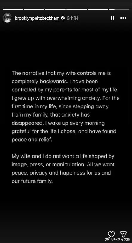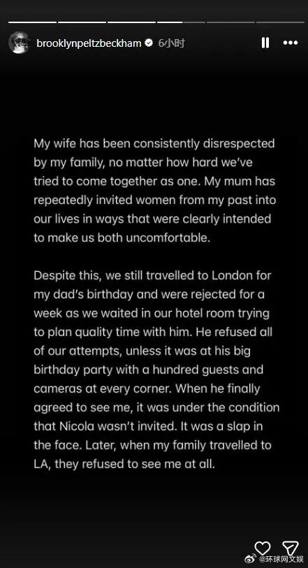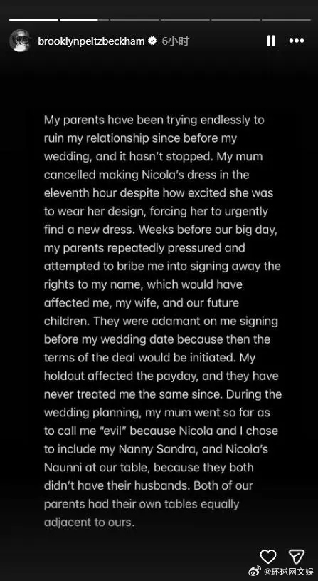【#贝克汉姆长子称父母的爱取决于社媒发文数据# 】在贝克汉姆一家“取关”的罗生门闹得沸沸扬扬之际,贝克汉姆(David Beckham)的大儿子布鲁克林(Brooklyn Peltz Beckham)在当地时间19日发文控诉亲爸亲妈。#贝克汉姆遭大儿子控诉# 布鲁克林称“不想与我的家人和解”。“家庭的‘爱’取决于你在社交媒体的发文数量,或者你是否能迅速放下手头的一切事务,赶过来拍摄全家福照片,哪怕这样做会损害我们的工作。”布鲁克林控诉,“多年来,我们一直竭尽全力出席每一场时装秀、每一场派对以及每一次媒体活动,以展示‘我们完美的家庭’。但有一次,我妻子请求我母亲在洛杉矶火灾期间支持救助流浪动物,而我母亲却拒绝了。”他还着重强调了父母在自己与妮可拉的婚礼前以及婚礼上的行为。据布鲁克林描述,在结婚前,他的父母就一直不遗余力地破坏他和妮可拉的关系。甚至在婚礼前,“我妈妈在最后一刻取消了为妮可拉制作婚纱礼服的计划,尽管她非常期待自己设计的婚纱,这让她(妮可拉)不得不紧急寻找新的礼服。”他还称在婚礼前夜,家人告诉他妮可拉“不是血亲”,也“不是家人”。而且,在他开始为自己抗争之后,就遭到了父母无休止的攻击,他的兄弟们也在社交媒体上攻击他,甚至屏蔽了他。第一支舞是他和妻子提前数周精心安排的一首浪漫情歌。然而到了现场,在500名宾客面前,在计划跳第一支舞的场地上等着他的却是亲妈。这还不够,据称维多利亚当时在所有人面前非常不恰当地贴着儿子跳舞。“我这辈子从未感到如此尴尬和羞辱。”布鲁克林说。#贝克汉姆长子称婚礼是最屈辱的时刻#