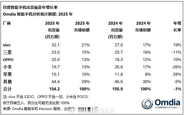 印度手机销量vivo第一,三星第二,OPPO第三,小米第四,苹果第五。