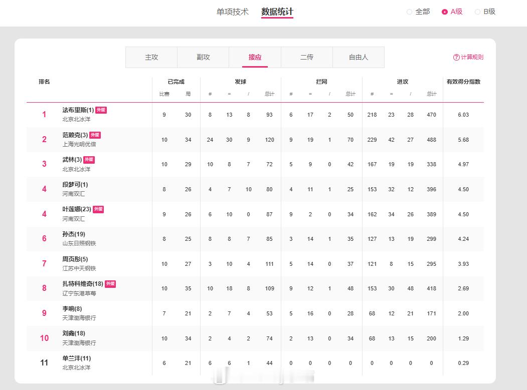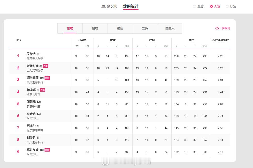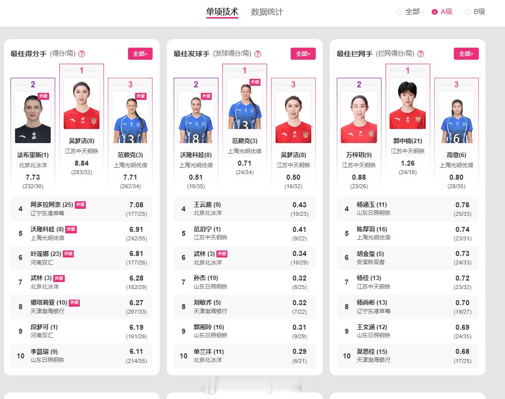 排超联赛技术统计上线,本次🈶将A级和B级分开单独进行排名排超联赛2025-2026中国排球超级联赛