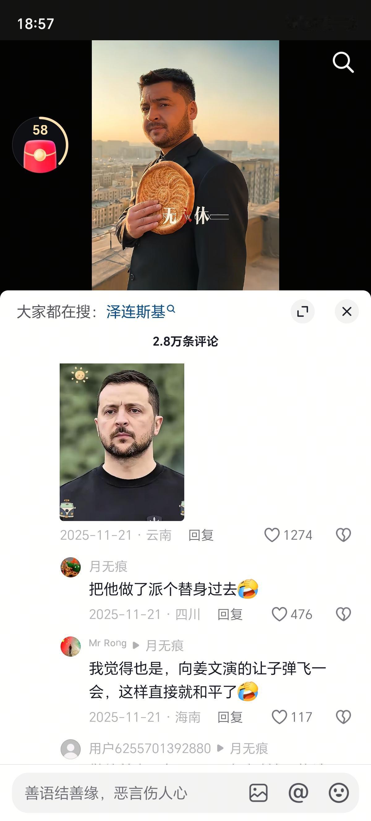 这是我们的打馕斯基,和泽连斯基长的是不是很像?就算泽连斯基本人来了也会傻傻分不清楚吧。我们的网友很有想法,让打馕斯基去乌克兰当替身,直接就和平了[捂脸][捂脸][捂脸][捂脸][捂脸][捂脸]