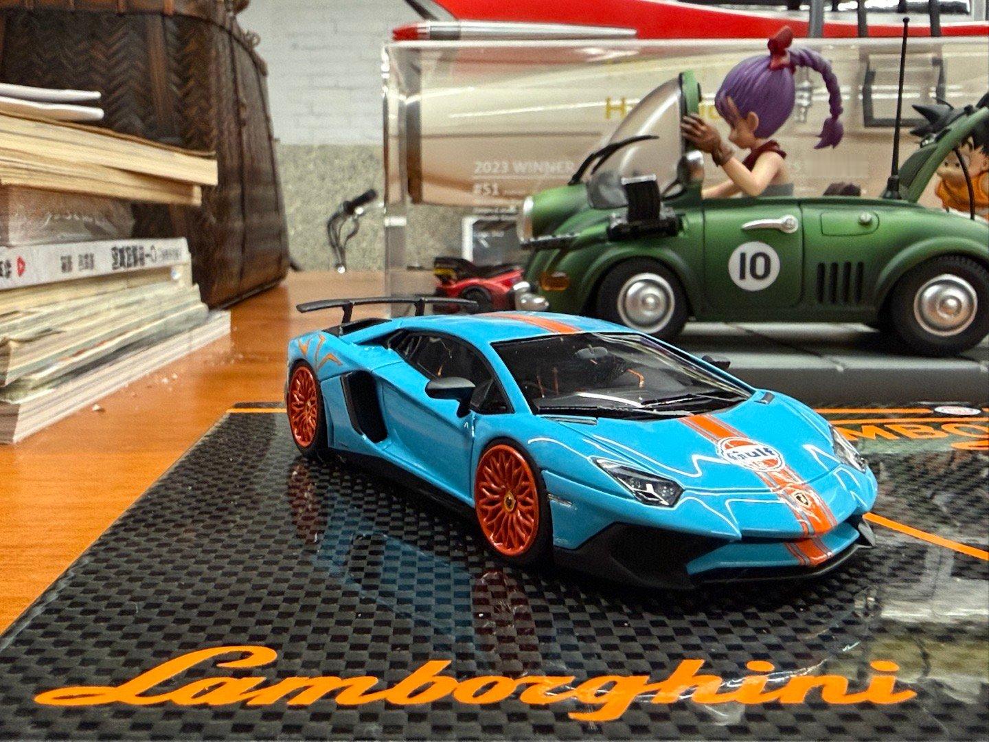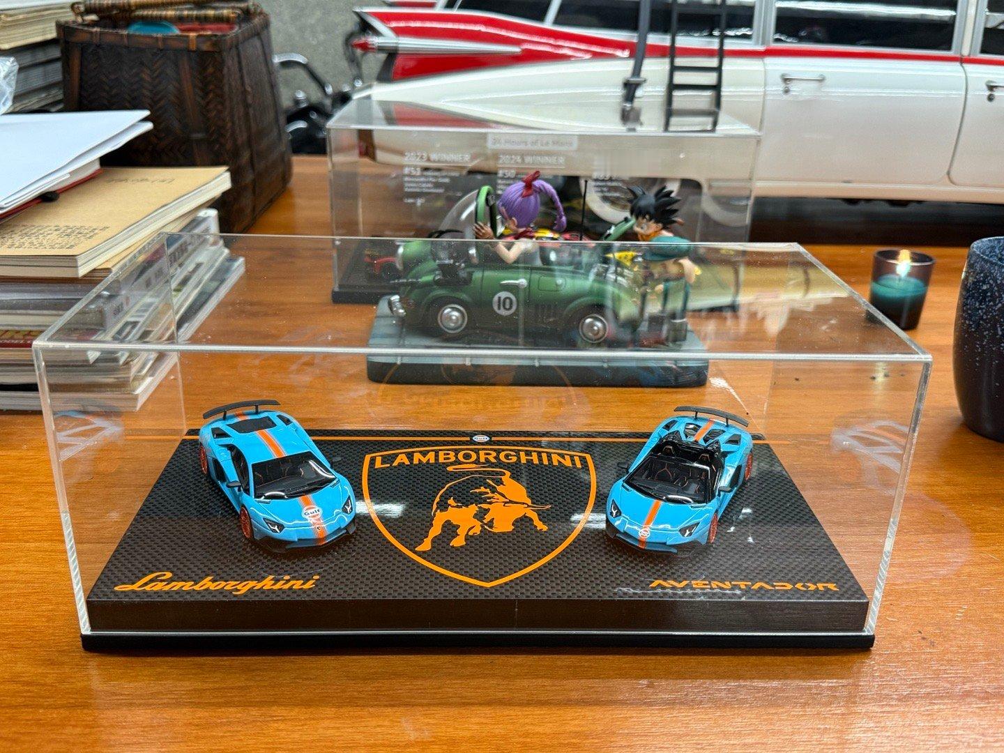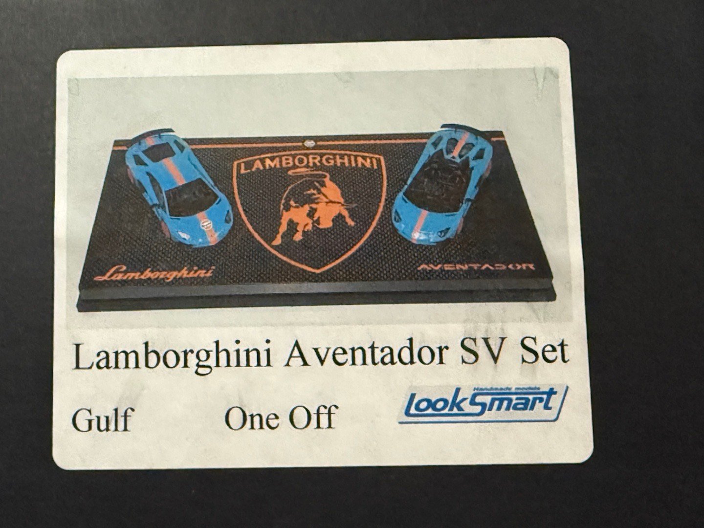 从库房翻出一套已经被遗忘很久的海湾石油兰博大牛SV套装,都忘记啥时候多少钱买的了…LookSmart 1:43树脂,做工一般,题材不错。一开始也没觉得啥特别,直到看到包装和底座上的one off(限定发行一台)字样海湾石油兰博基尼汽车模型