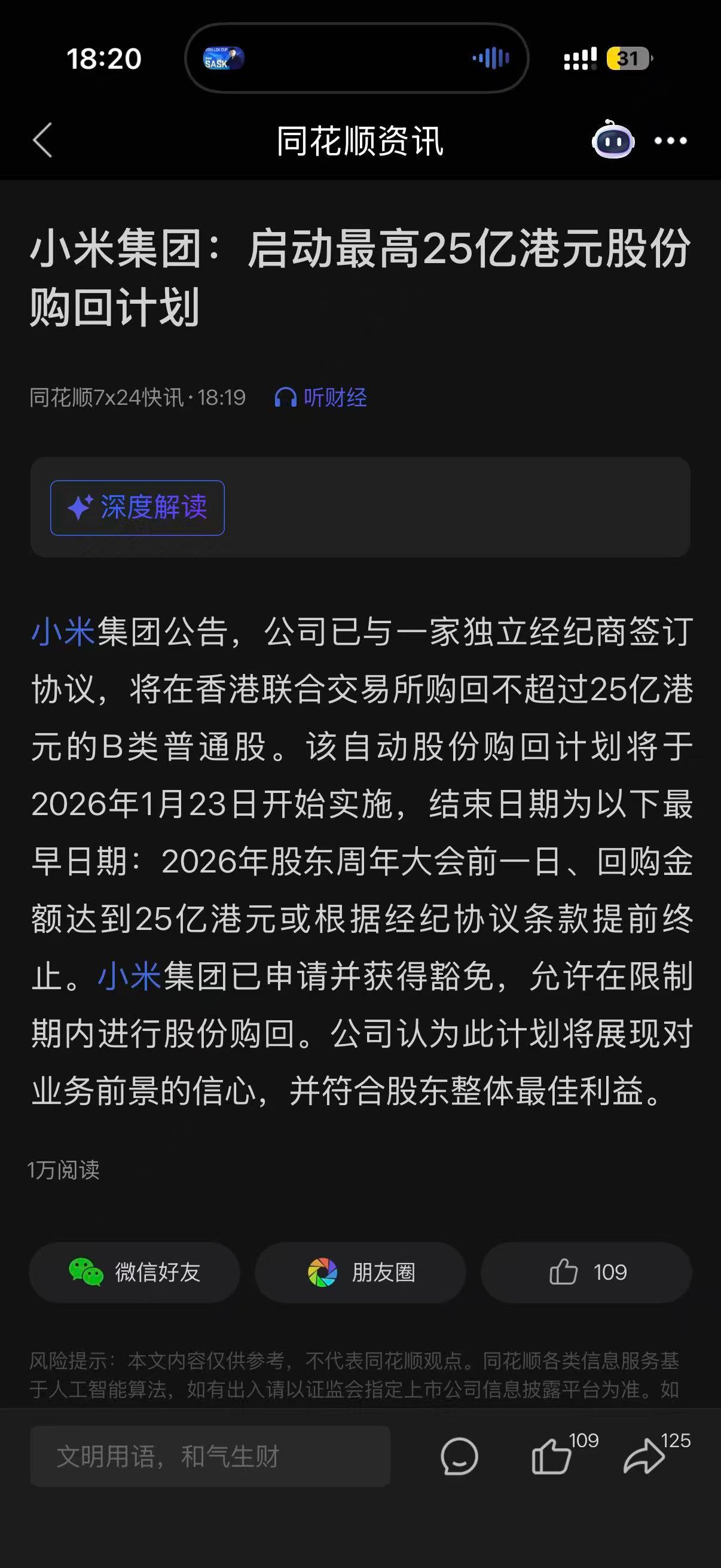 小米启动 25 亿港元回购计划,对比之前一两个亿都是洒洒水了。这次是真该起飞了吧?