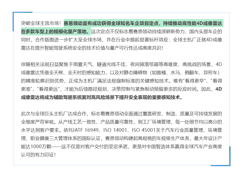 继新势力、国内头部车企。4D毫米波雷达厂商赛恩领动再下一城,拿下了某全球智能车企