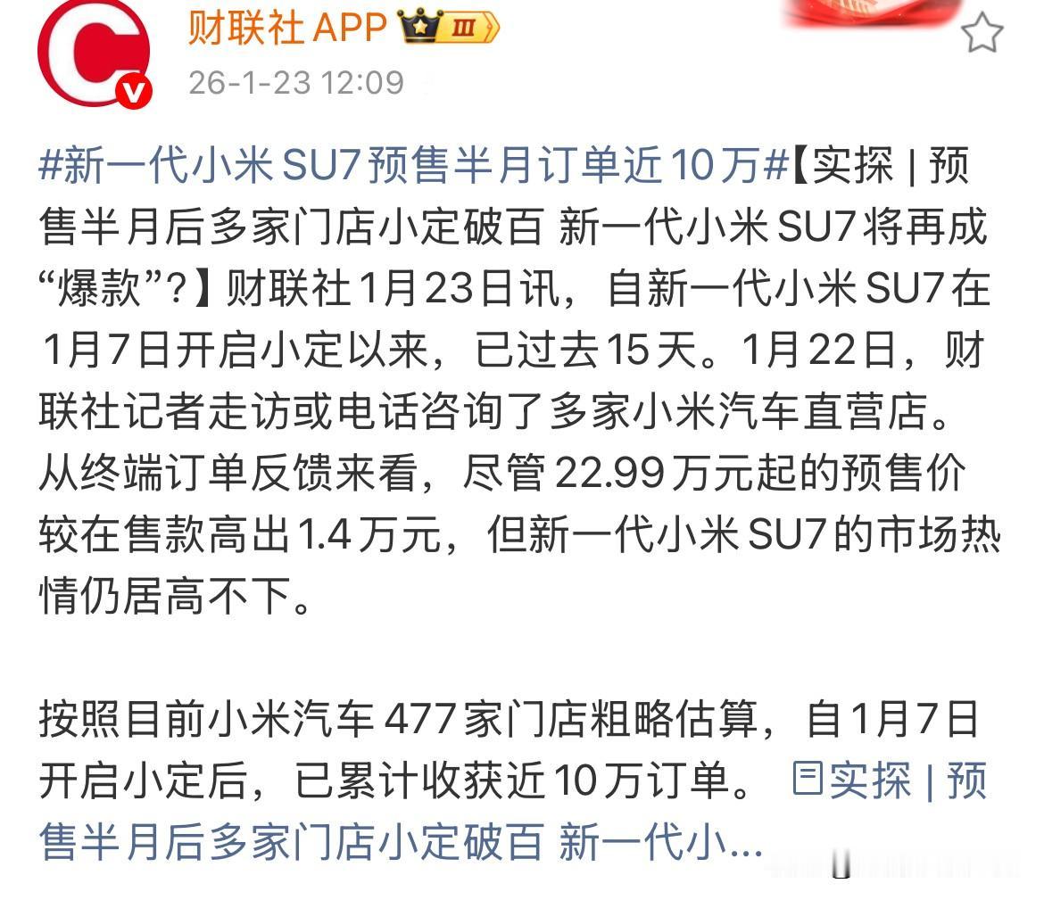 小米现在这海报做的。 真的可以说是“赏心悦目”了。 一切都很清晰、明了,就是“2200Mpa小米超强刚”,没有任何可能引起歧义的空间和词汇。 这应该是我在车圈见到的最干净的海报…… 甚至连一个“小字”备注都没有,绝对是海报中的标杆,友商们真的可以学学,也跟上。 今天(财联社)消息说(图二),新SU7的预售订单近10万了,也不知道真假。 但就奔着小米现在谦虚、诚恳的态度,我相信肯定差不了。 态度决定一切。