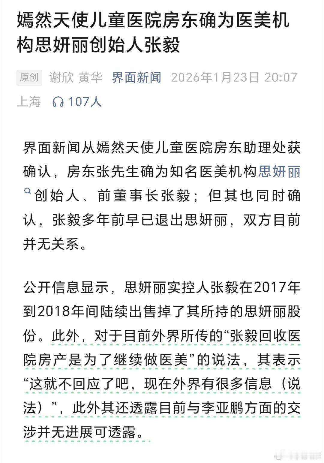 据界面新闻,嫣然天使儿童医院房东确为医美机构思妍丽创始人张毅。