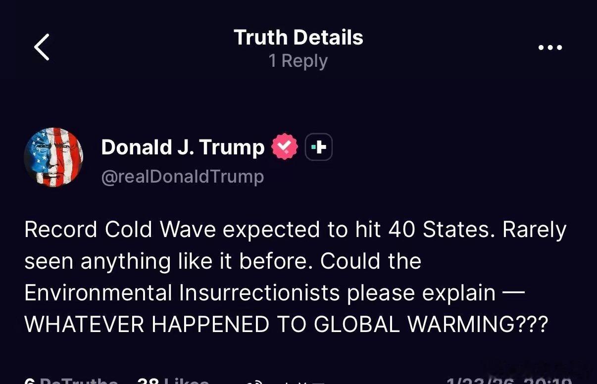 特朗普要求环保人士给出解释预计创纪录的寒潮将袭击 40 个州,此前从未见过如此情形。环保激进分子们能否解释一下——全球变暖之说到底怎么了?