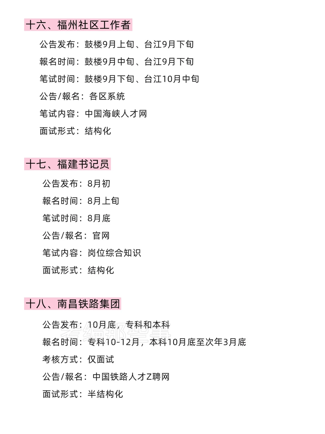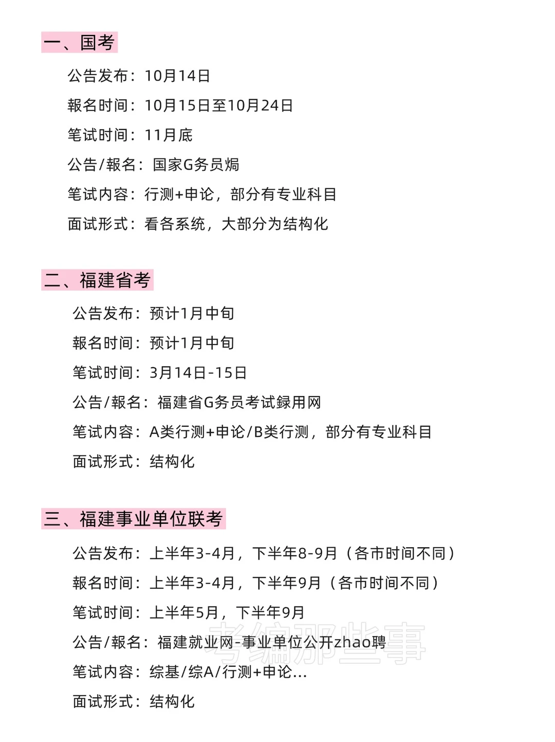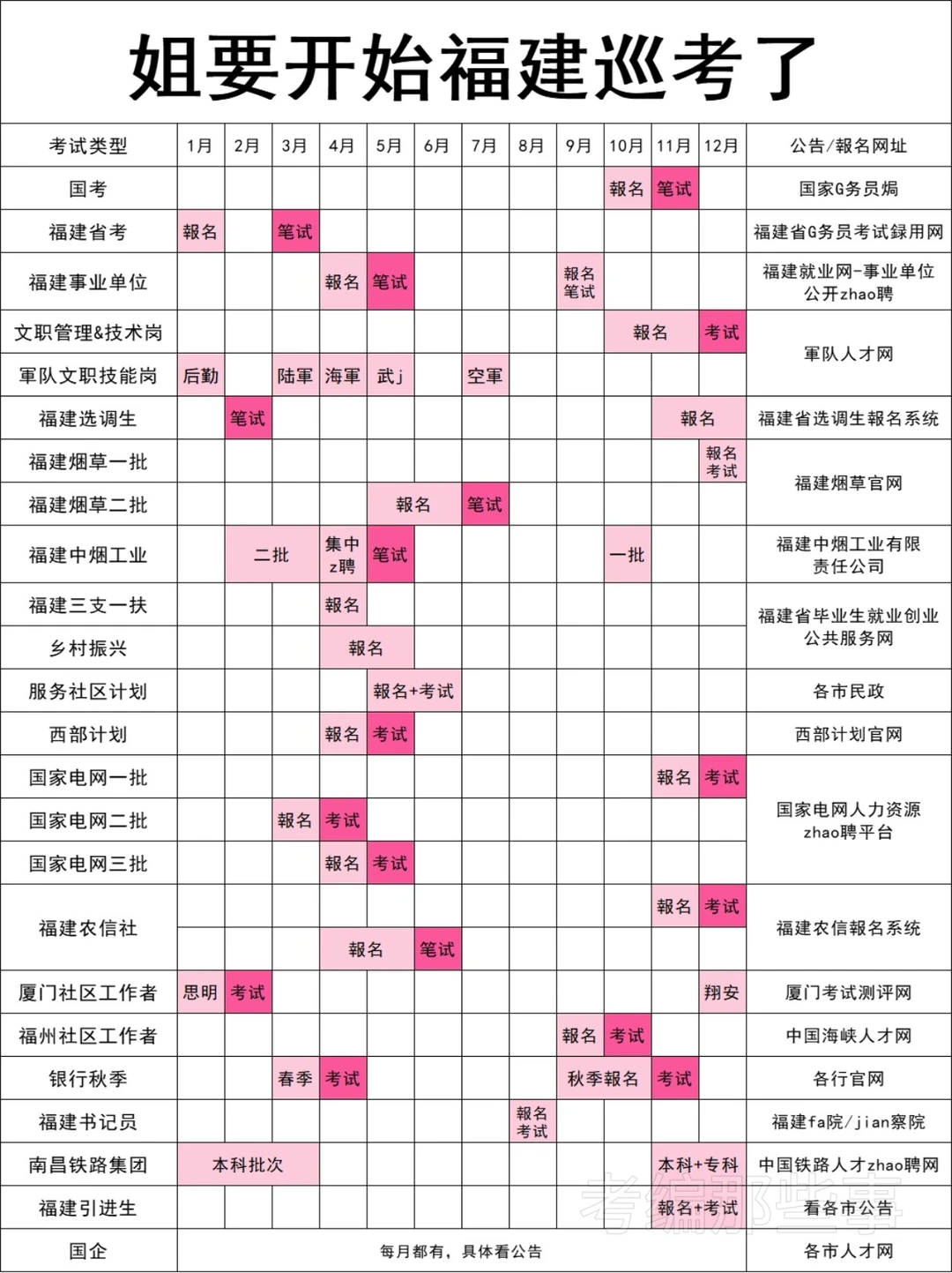 福建考公考编的同学们,如果有还不清楚福建省有哪些上岸机会的话,可以看本篇,小编为大家统计了福建省比较大型的一些考试,包括出公告时间、報名时间、笔试时间、笔试内容等,根据往期公告整理,可以作为参考