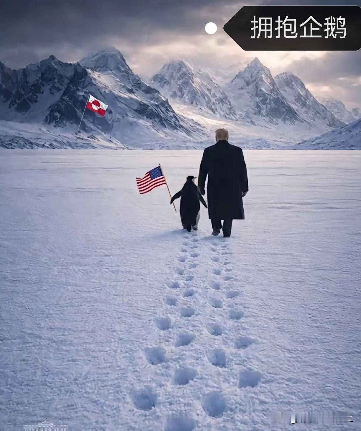 特朗普,相由图生! 可以说,已经离开达沃斯的特朗普又闹了个笑话! 白宫的贴图,特朗普在北极的雪地里艰难的朝格陵兰岛走去,身边是结伴而行手持星条旗的企鹅!看来特朗普仍旧心心念念格陵兰岛! 北极没有企鹅,企鹅在南极!这些是特朗普故意设置的话题梗,此前特朗普信誓旦旦,不排除借助武力抢占格林兰岛,现在用萌宠企鹅带路,试图让剑拔弩张的夺岛尖锐行为予以淡化! 丹麦看到这幅图,后背还是凉飕飕的,即便回到白宫的特朗普,心思仍旧停留在北极圈! 会不会有一种可能?觊觎格陵兰岛的特朗普,又开始对南极动脑筋!