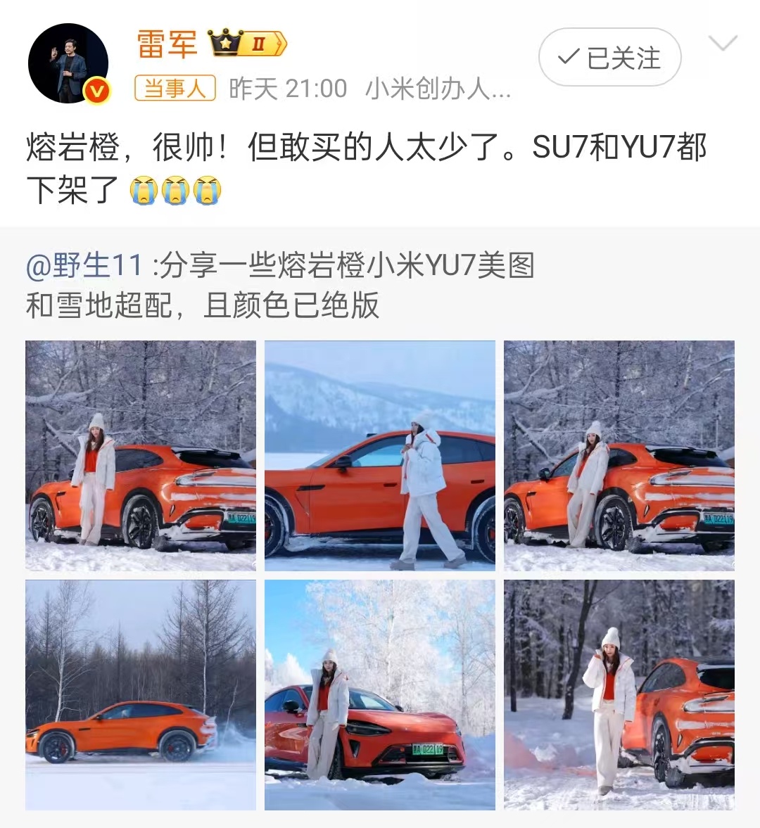雷军称小米汽车熔岩橙配色敢买的人太少其实熔岩橙在现实里看到确实很亮眼,回头率拉满。但这种高饱和度的颜色,虽然拍照好看,日常用还是需要点勇气。大多数人买车还是偏向黑白灰这类百搭色,不容易过时,也更保值。说白了,这就是“小众好看”和“大众实用”之间的矛盾。小米这次下架也算是及时调整,把产能留给了更走量的颜色。毕竟卖车不是做潮牌,还是得贴合大多数用户的实际选择。雷军回应下架小米汽车熔岩橙配色