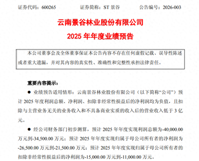 ST景谷(600265)1月26日晚公告,经公司财务部门初步测算,预计2025年年度实现利润总额为-4亿元到-3.45亿元;预计2025年年度实现归属于母公司所有者的净利润为-2.65亿元到-2.15亿元;预计2025年年度实现归属于母公司所有者的扣除非经常性损益后的净利润为-1.5亿元到-1.1亿元。