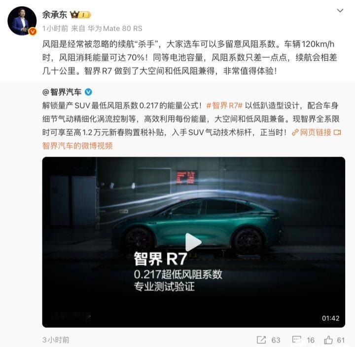 难怪车企会花重金去降低风速!原来风阻对续航影响这么大! 电动车高速续航腰斩?余承东一语道破真相:120km/h时速下,70%能耗都耗在对抗风阻!风阻与车速平方成正比,速度提50%,阻力飙至2.25倍,这才是续航缩水元凶。 鸿蒙智行智界R7实测风阻系数0.217,刷新全球量产SUV最低纪录!风阻系数每降0.01续航多跑数公里,0.04差距高速续航差80公里。 它靠流线造型、平整底盘降阻,还没牺牲空间,选电车别只看电池,风阻系数才是高速续航硬指标!