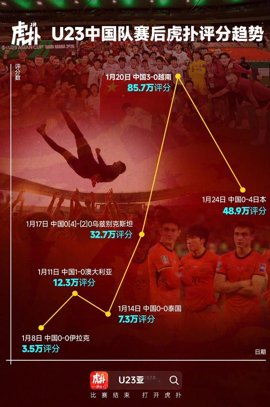 本届U23亚洲杯落下帷幕,中国队夺得亚军创历史最佳成绩,本届赛事国足比赛的评分变化也彰显了球迷们的关注。半决赛3-0战胜越南的比赛评分数突破85万,创下了虎扑足球比赛的历史记录,决赛虽然结果不尽人意,但依然有接近50万打分。历史性战胜澳大利亚与点球大战淘汰乌兹别克斯坦的比赛,同样分别有12万与32万JRs打分。