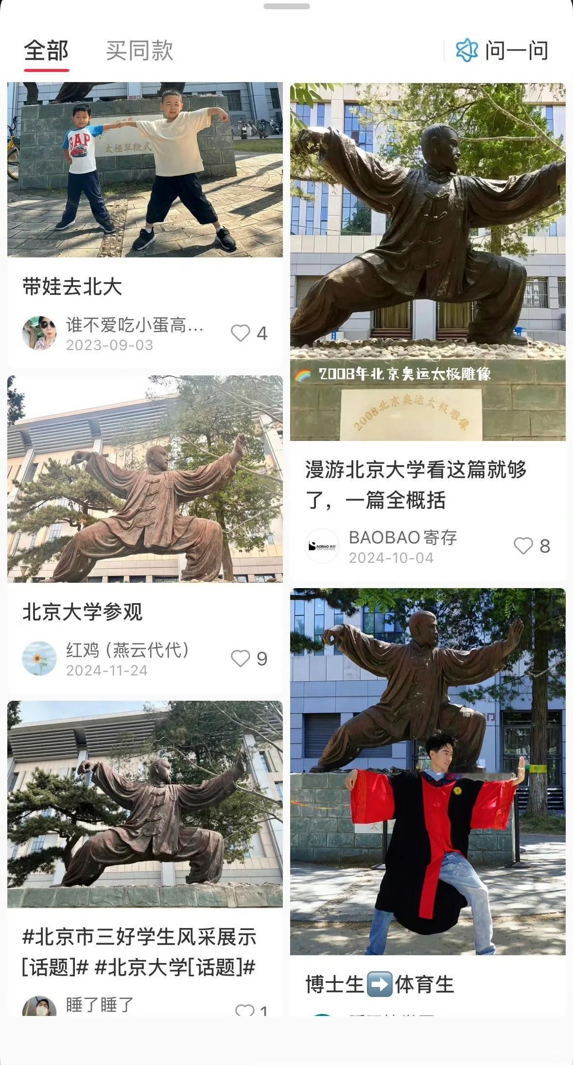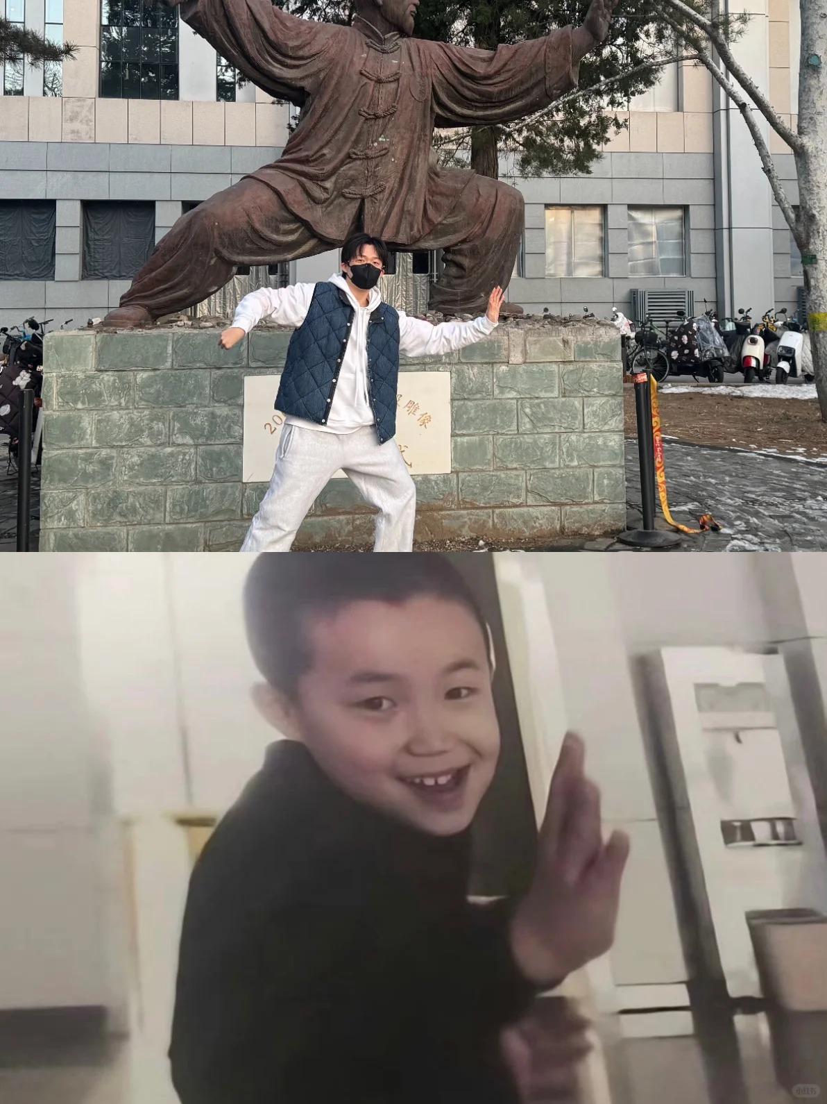 原来北大研究生是这么宣传北大的呀! 今天王楚钦冷不丁发了日常,配文:最近的停停走走 有风景图,也有自己的照片,还以为去哪里玩了,仔细一看,原来是在学校呀! 王楚钦穿着休闲的白色内搭和棉马甲,戴着口罩,与身后雕塑的动作完美呼应,模仿的还挺惟妙惟肖的,不愧是从小就爱模仿的达人! 照片中的小王,还戴着眼镜,突然就想到他调侃草莓熊的梗:眼镜有片是文化人呀! 冷知识:这座太极拳主题雕塑是北大校园的标志性打卡点之一,原型是近代武术家孙禄堂,雕塑展现了太极拳 “松沉稳健、开合有致” 的典型姿态。 最后,手拿小葫芦,身戴麒麟项链,一生福禄的节奏! (图片来源于网络)